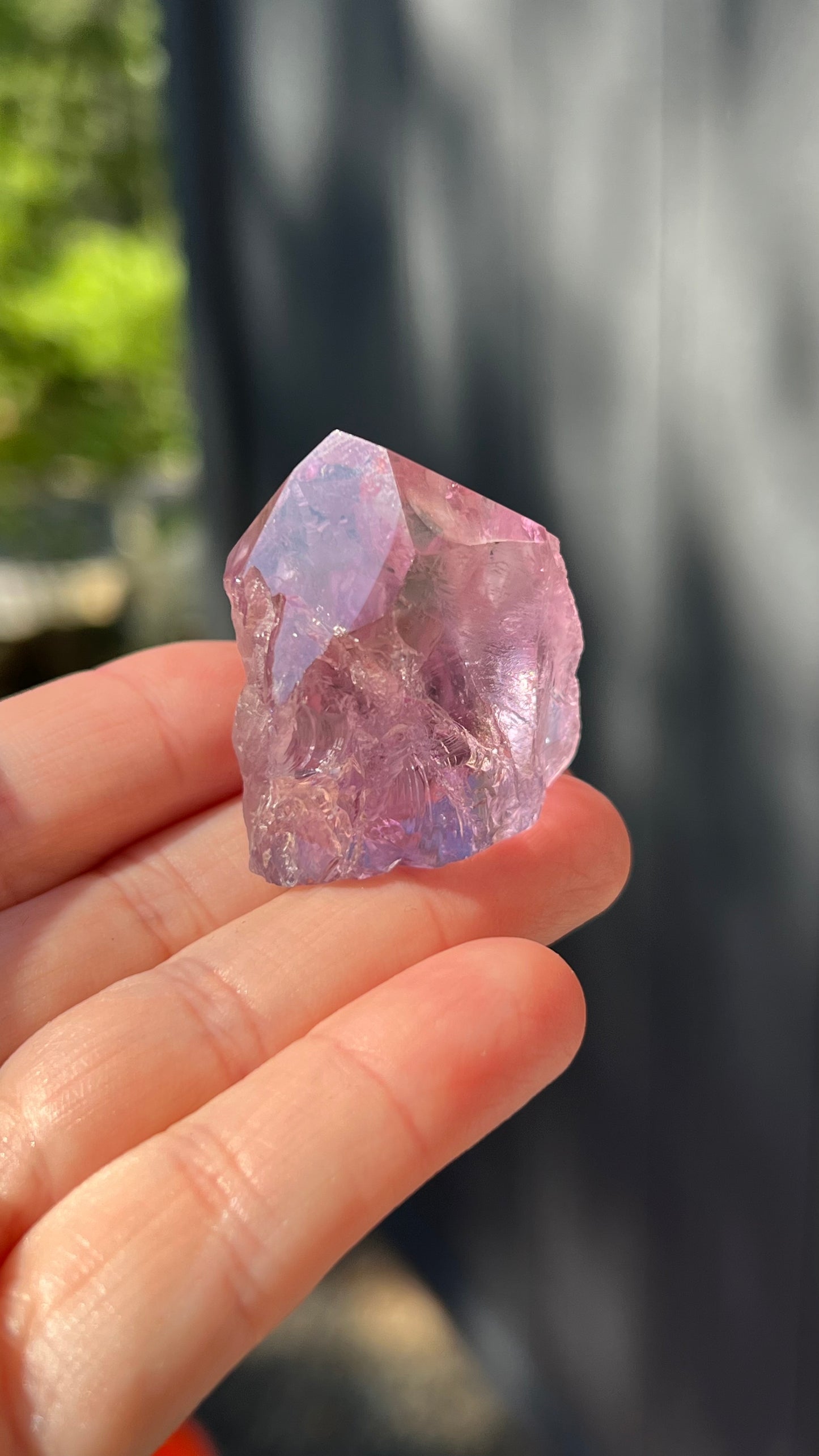 This listing is for the Ametrine crystal shown. Featuring a gemmy old stock amethyst + citrine. Great color, zoning and optical clarity from Bolivia. A partial polish at the termination allows you to really appreciate the Ametrine, vibrance and clarity of the crystal. The entire piece is pure crystal, no matrix on this one. Reflective prisms inside display beautiful rainbows throughout the internal world! In the sun you can see a magenta shade of the amethyst. Indoors the amethyst looks pink like rose de france amethyst. An exceptional ametrine for the price. The sides are natural and not polished. A simply beautiful amethyst with natural citrine from Boliva.