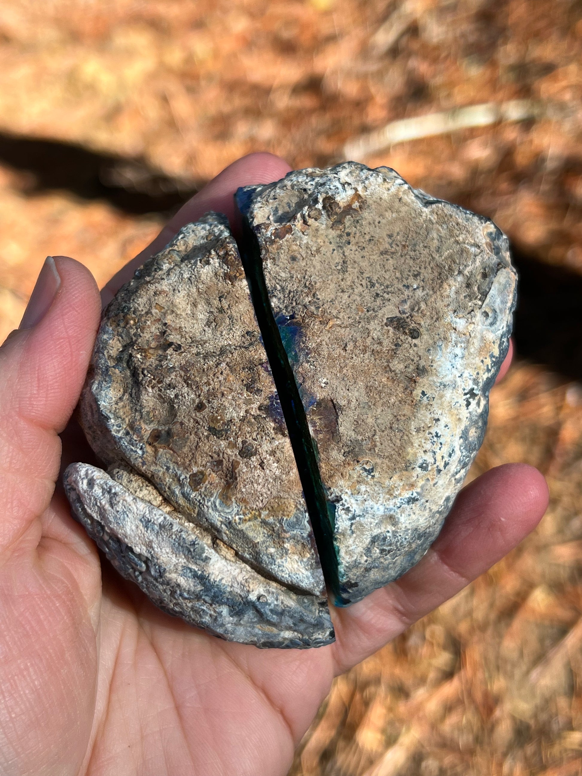 These geodes are known for their exquisite feathered pattern with swirls of white, black, beige, brown and reds. They are formed when air bubbles became trapped in hardening lava. Most have crystal druzy centers and crystal points.