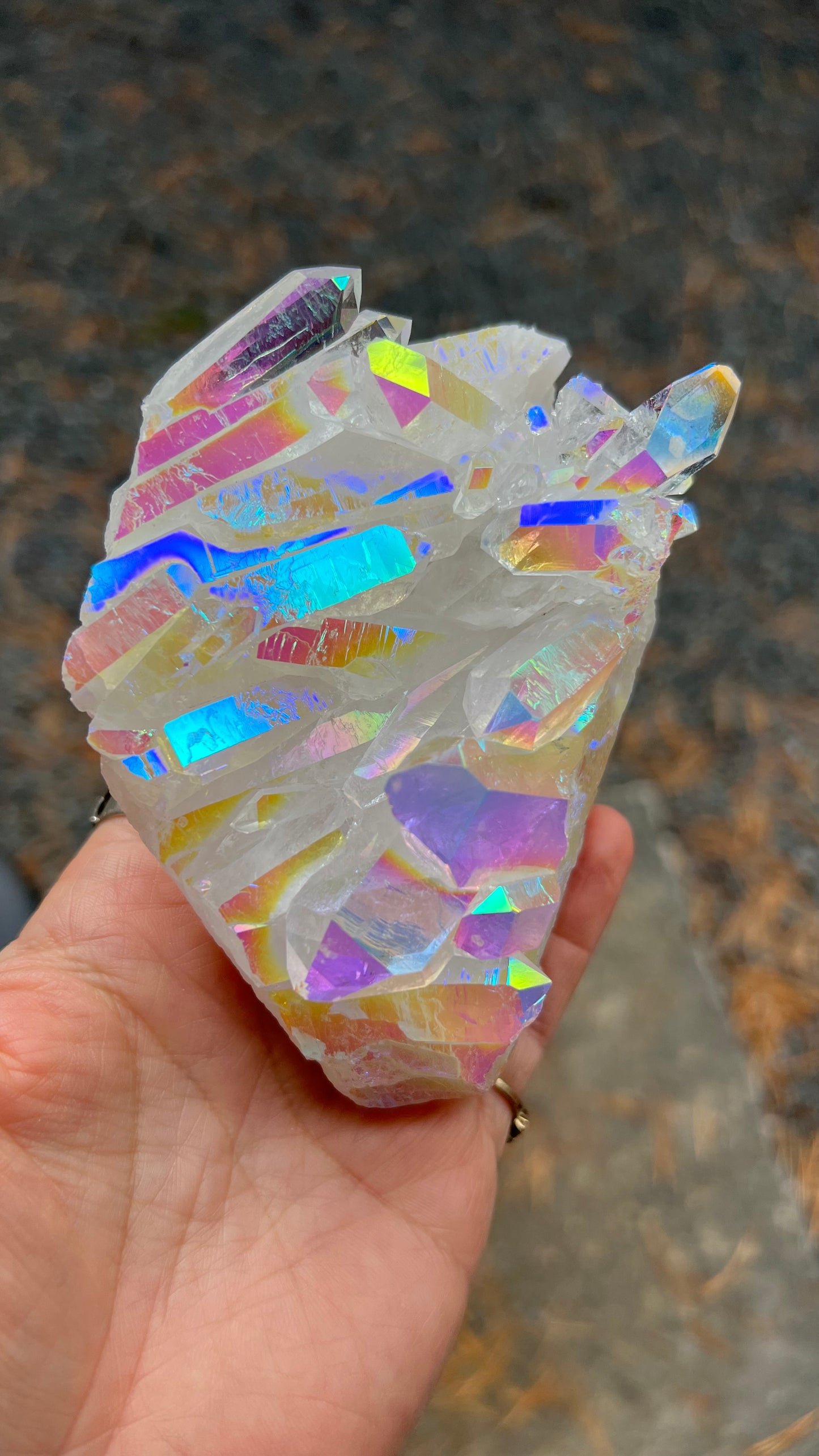 Angel Aura is a crystal quartz that has been magically enhanced through a process of alchemy, with natural metals through a vapor deposition process.