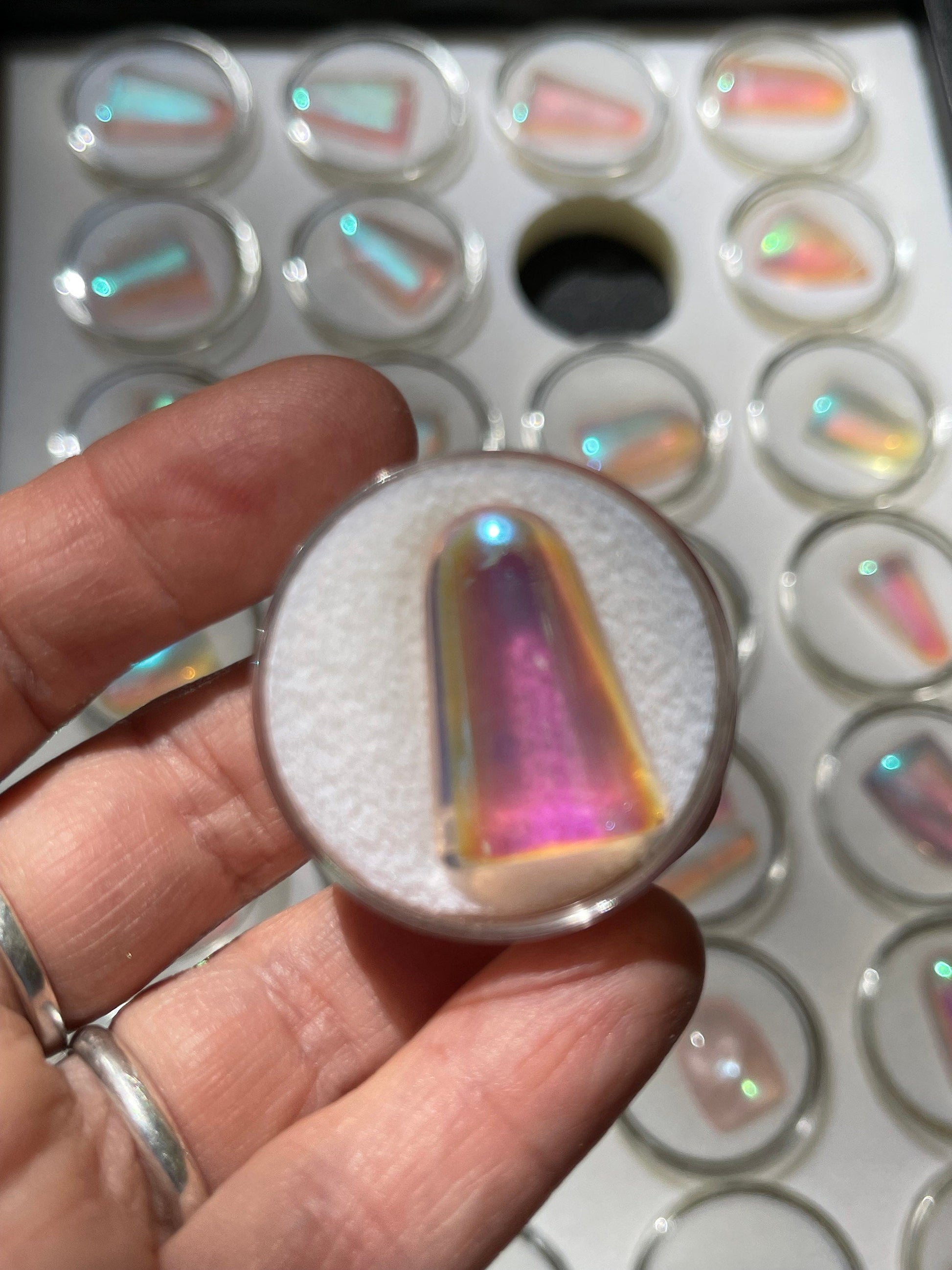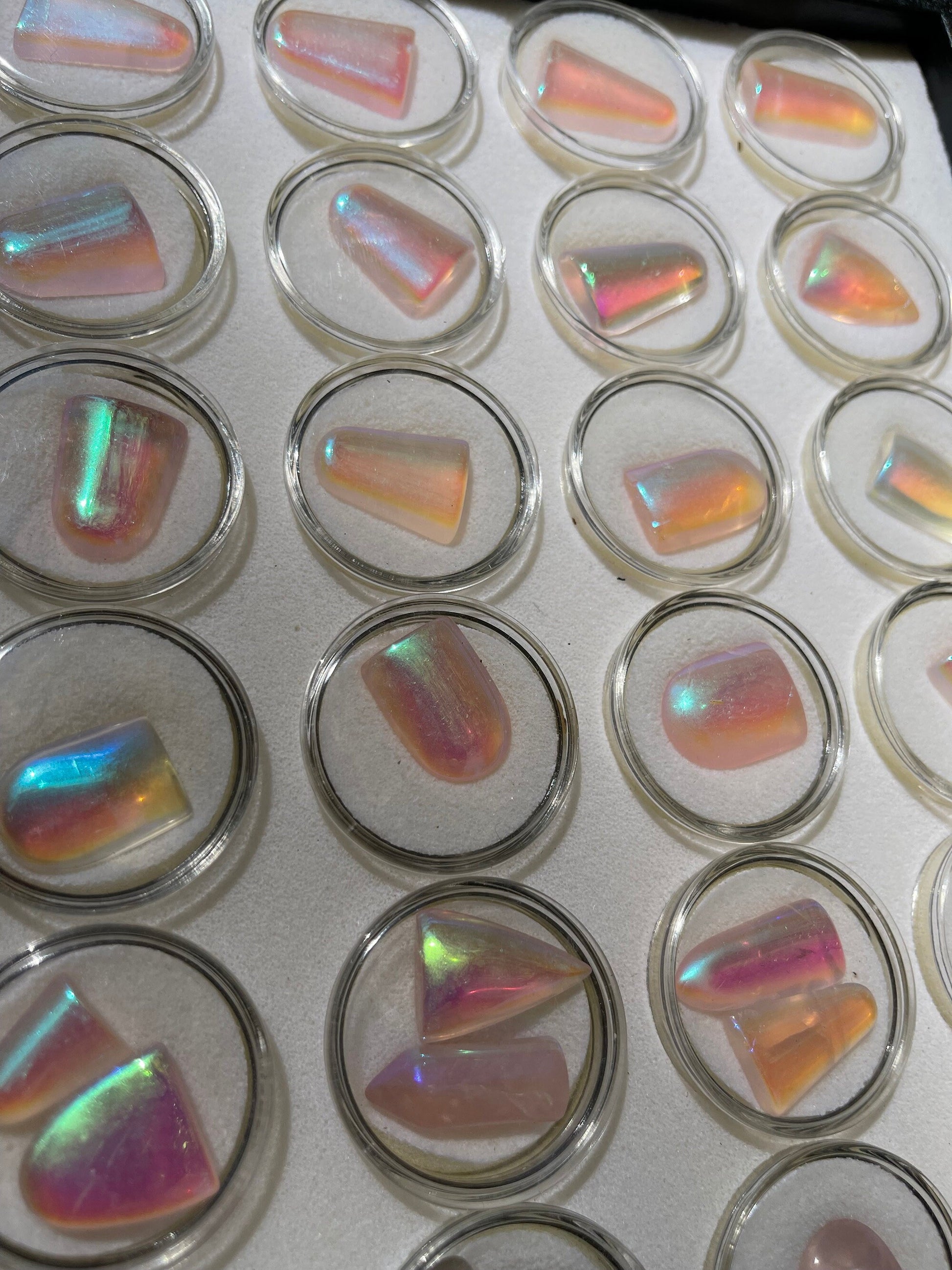 This listing is for top quality Angel Aura Rose Quartz Gemstone tongue shape freeform shown. Flat bottoms. Most will self-stand. These gorgeous Rose Quartz are just beautiful..very gemmy, with amazing clarity..color ranges from nice rich opalescent pink to paler pink. Price is for 1 piece. These are super hard to find. This lot is from an old collection that we kept in our private collection and aura enhanced a small batch. Enjoy!