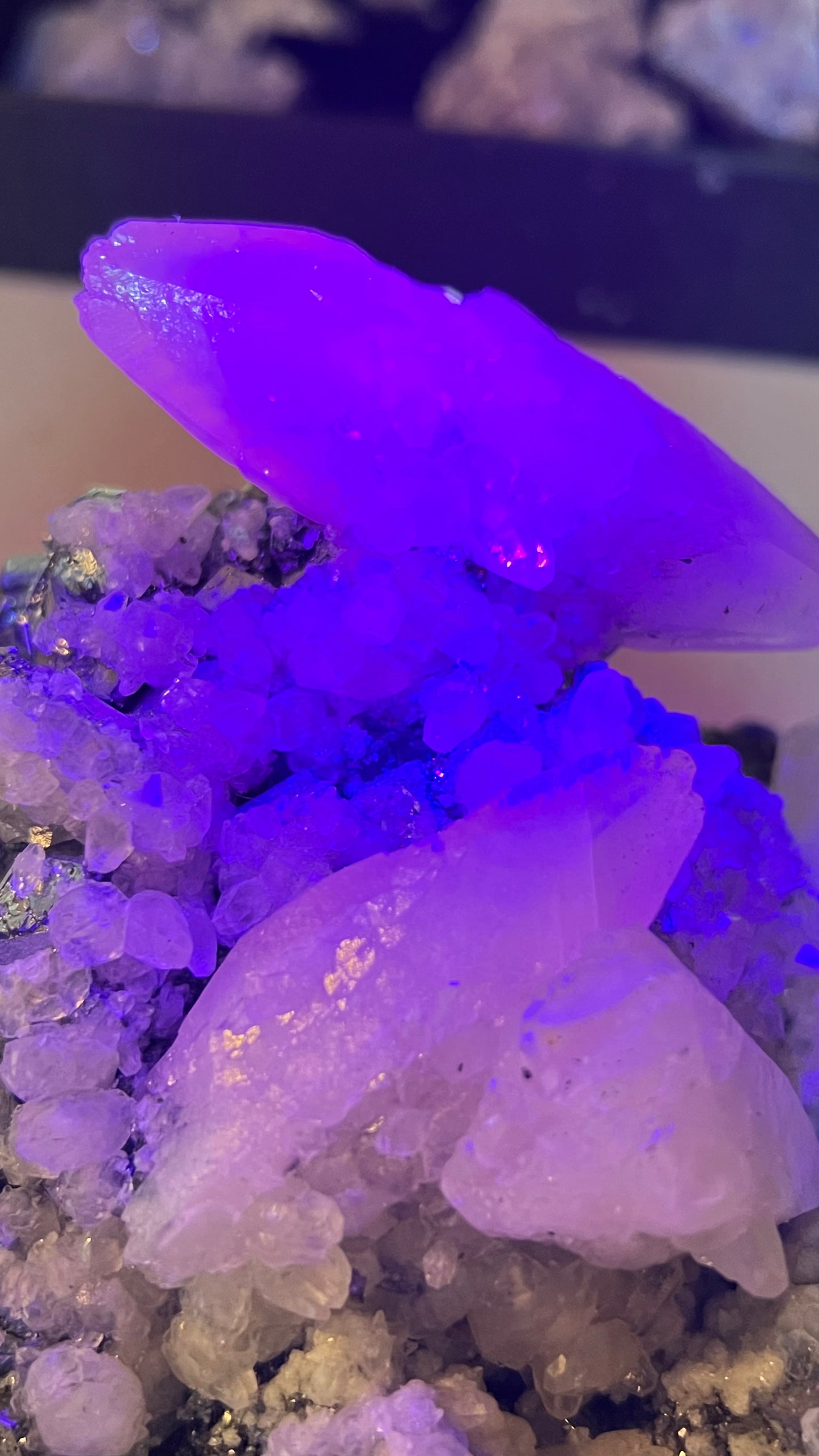 This listing is for the gorgeous cluster of scalenohedral (dogtooth) calcite crystals that formed from a pyrite and arsenopyrite matrix. The metallic minerals sparkle and shine and offer an amazing contrast of color. The base of pyrite has nice defined striations, and some have a natural rainbow iridescence to them. It was collected from the Huanzala Mine in Peru. Under short-wave ultraviolet light, the calcite crystals fluoresce a vibrant pink color. Very aesthetic crystal cluster that would be wonderful topic of discussion in any room! A magical addition to any collection!