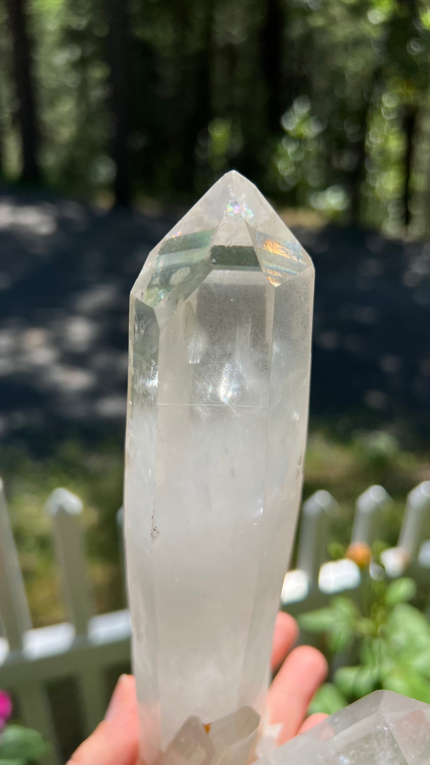 This listing is for the Quartz crystal lemurian shown. Featuring an unpolished quartz, all natural with a really nice prismatic main crystal (8 inches tall) and multiple points around the base. A future time-link window is on the main face of the largest point. There’s a few rough edges around the tip and the imperfections, or natural character, I like to say, are reflected in the price. There is some red hematite that gives the lower half a subtle pink hue. This crystal is able to stand up vertically on its own base. A magical addition to any collection! Simply beautiful with great energy!