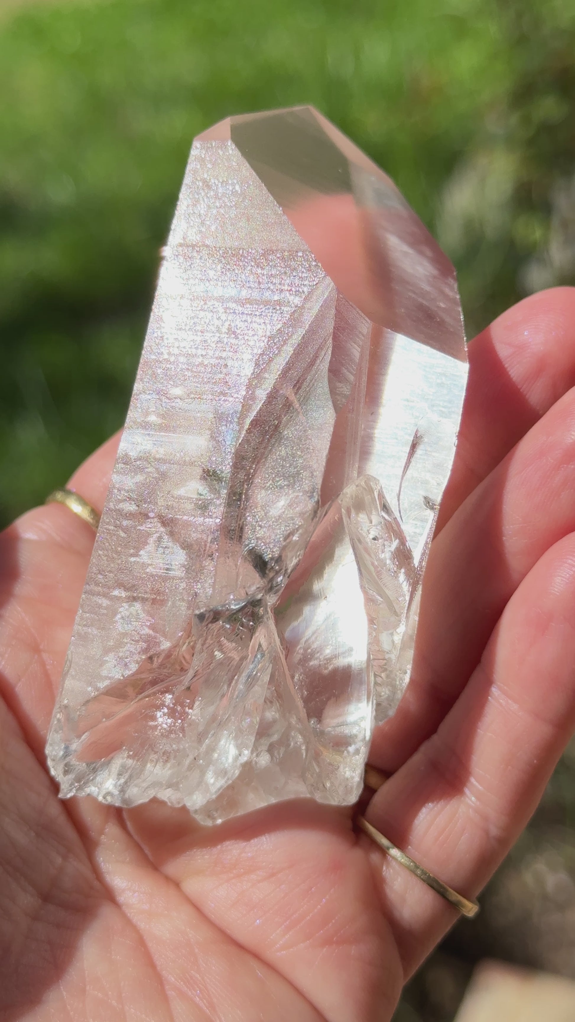 This listing is for the lemurian quartz shown. Featuring a quartz crystal with nice lemurian striations and great clarity this locality is known for. This crystal has a long future time-link window, surface pink hematite on two sides and internal reflective rainbow prisms. There are also multiple recordkeepers. This quartz is clear from top to bottom. At the bottom the reflective prisms give it a beautiful aesthetic! A quality quartz with great energy! A magical addition to any collection!