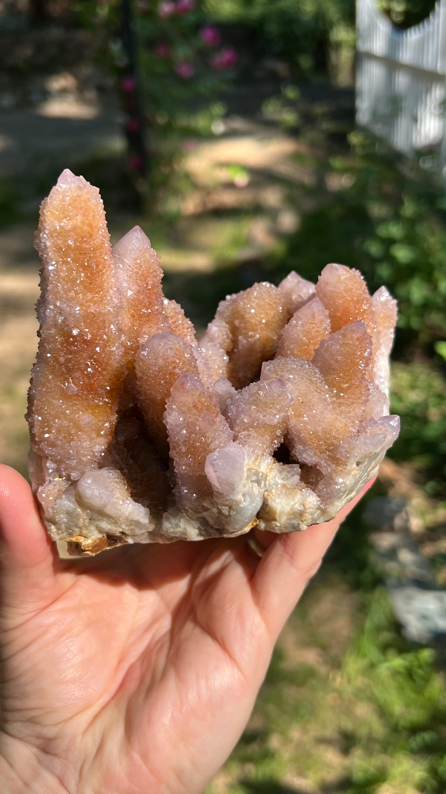 This listing is for the Spirit Quartz shown. Featuring a dreamy lavender cactus quartz in aesthetic form. This crystal is really beautiful! The tiny crystals covering the points are very lustrous and reflective. The longest point is 4" and the graduation of different size crystals creates an eye catching and very calming cactus cluster. The rich saturation of hematite and iron offer up a lovely dimension and contrast of color between the soft amethyst. This one would fit anywhere. A magical addition to any collection!