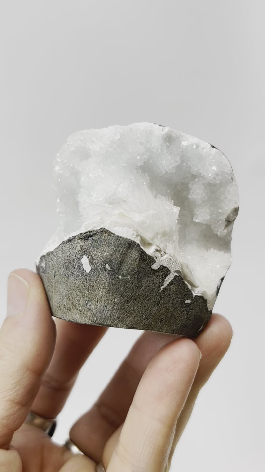 This listing is for the Natrolite geode shown. Featuring a gorgeous spray of Natrolite needles in beautiful form nestled against its own matrix. A prismatic and sparkling backdrop of quartz shimmers around it! A magical addition to any collection! Natural, polished geode. Self-standing.