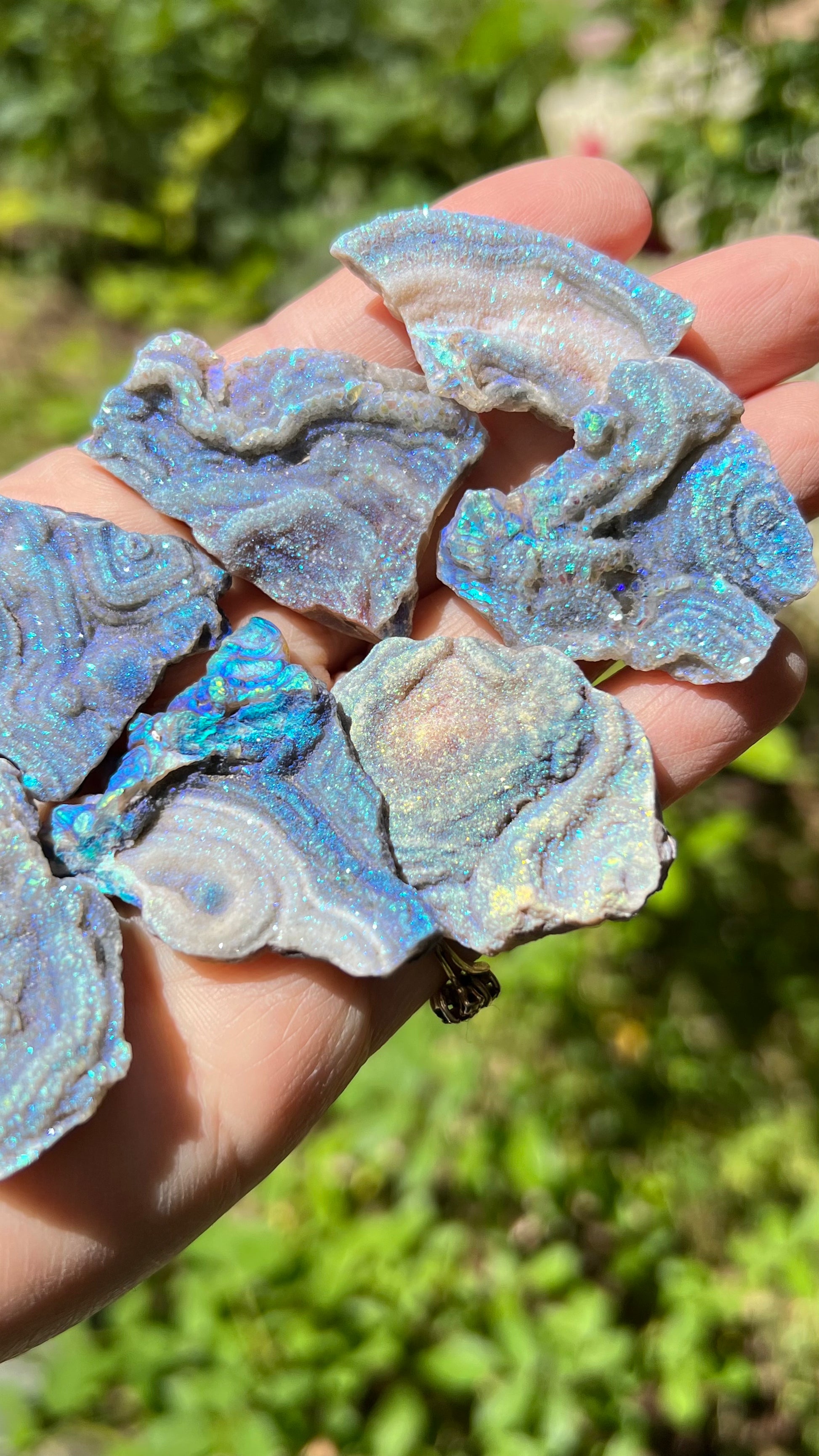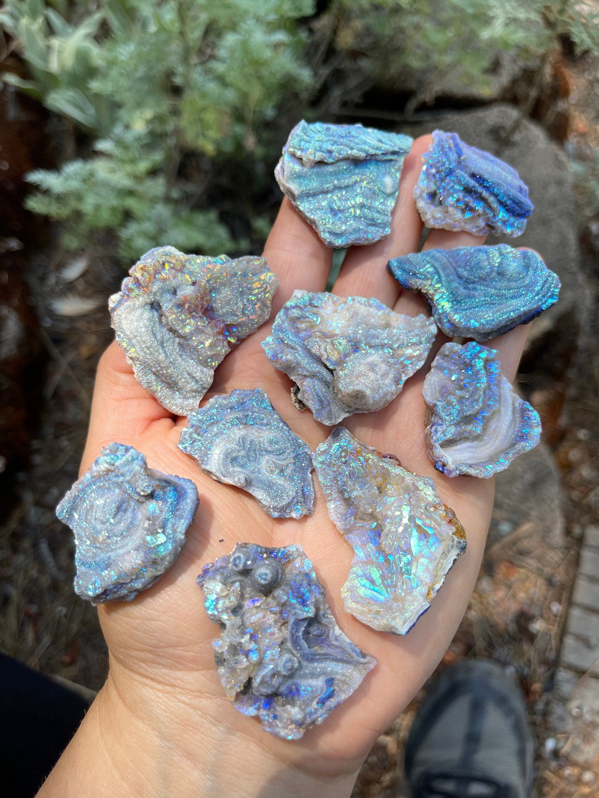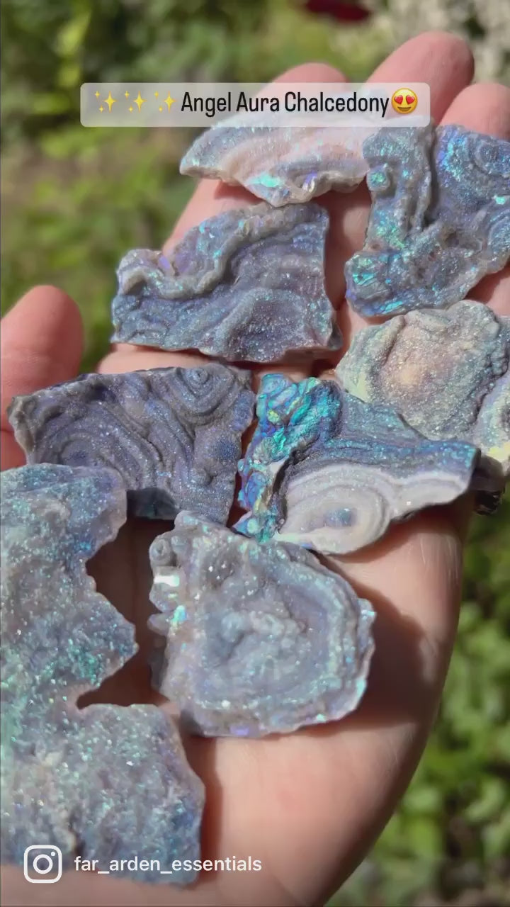 This listing is for the (1) one Angel Aura Chalcedony crystal. Featuring extra sparkly, high grade chalcedony pieces with druse, swirls and micro crystals that sparkle so beautifully! Your chalcedony angel aura will be chosen from our extra high grade selection of these chalcedony conchos!