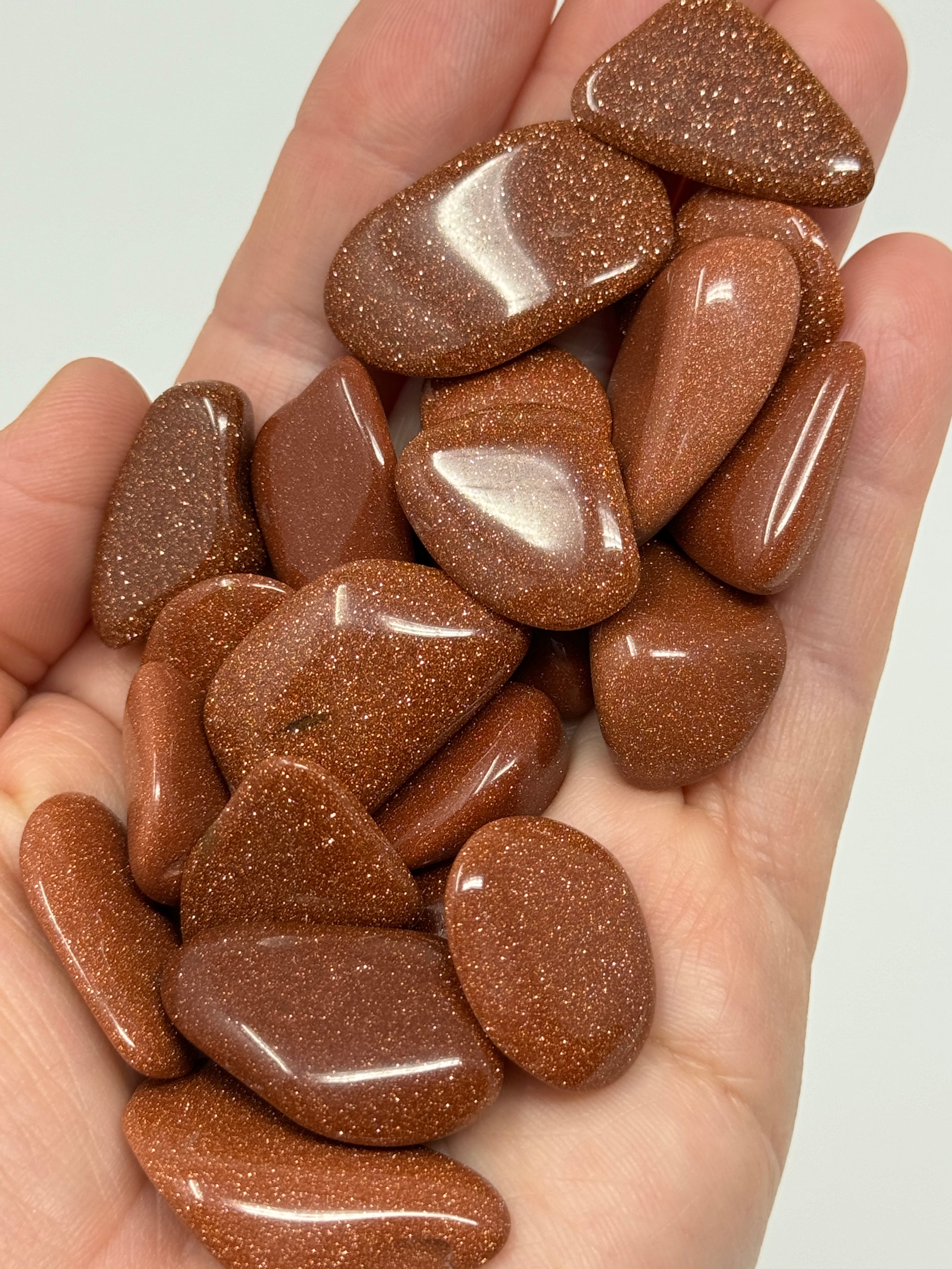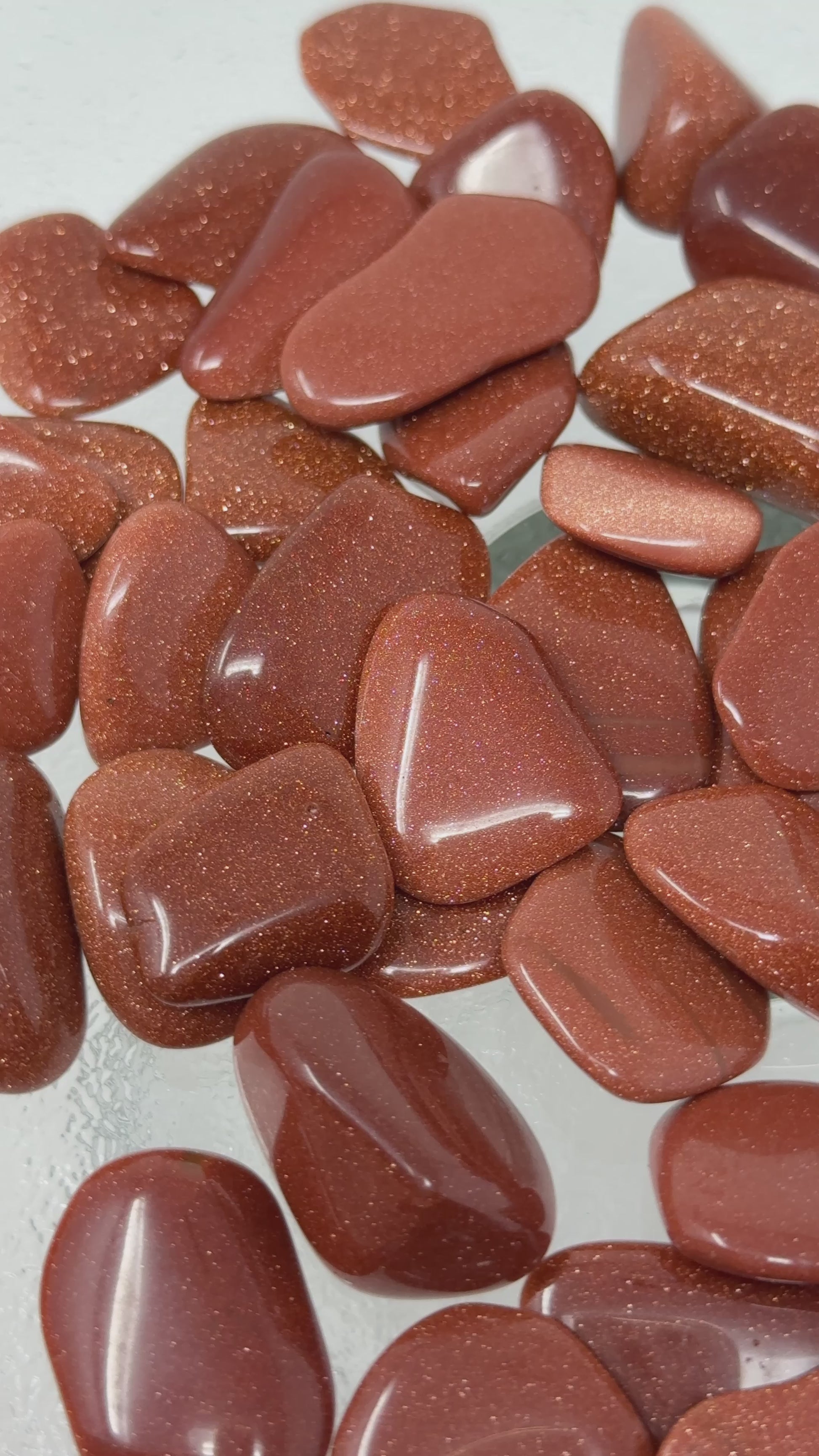 This listing is for one (1) goldstone tumble from the lot shown. Featuring extra sparkling and shimmer goldstone with smooth feel. Goldstone is a man-made glass material.