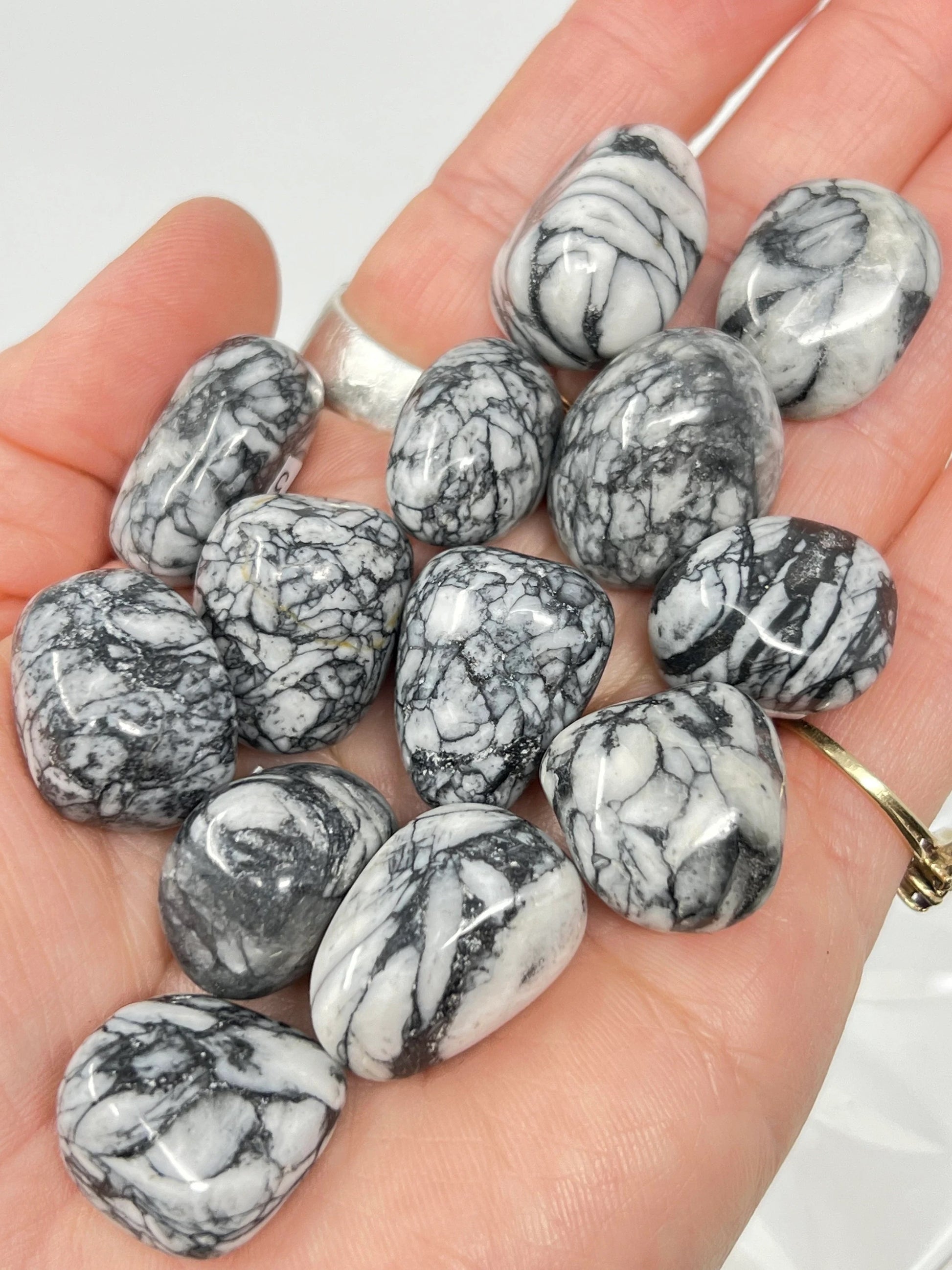 This listing is for (1) one Picasso Jasper pocket stone from the lot shown. These Jasper are full of the highly sought after contrasting colors of black, white and grey with incredible patterns of swirls and webbing. Very eye catching and powerful. Each jasper looks like a piece of art, wherein the name was originated! Picasso! You will receive your intuitively chosen stone from the lot shown.