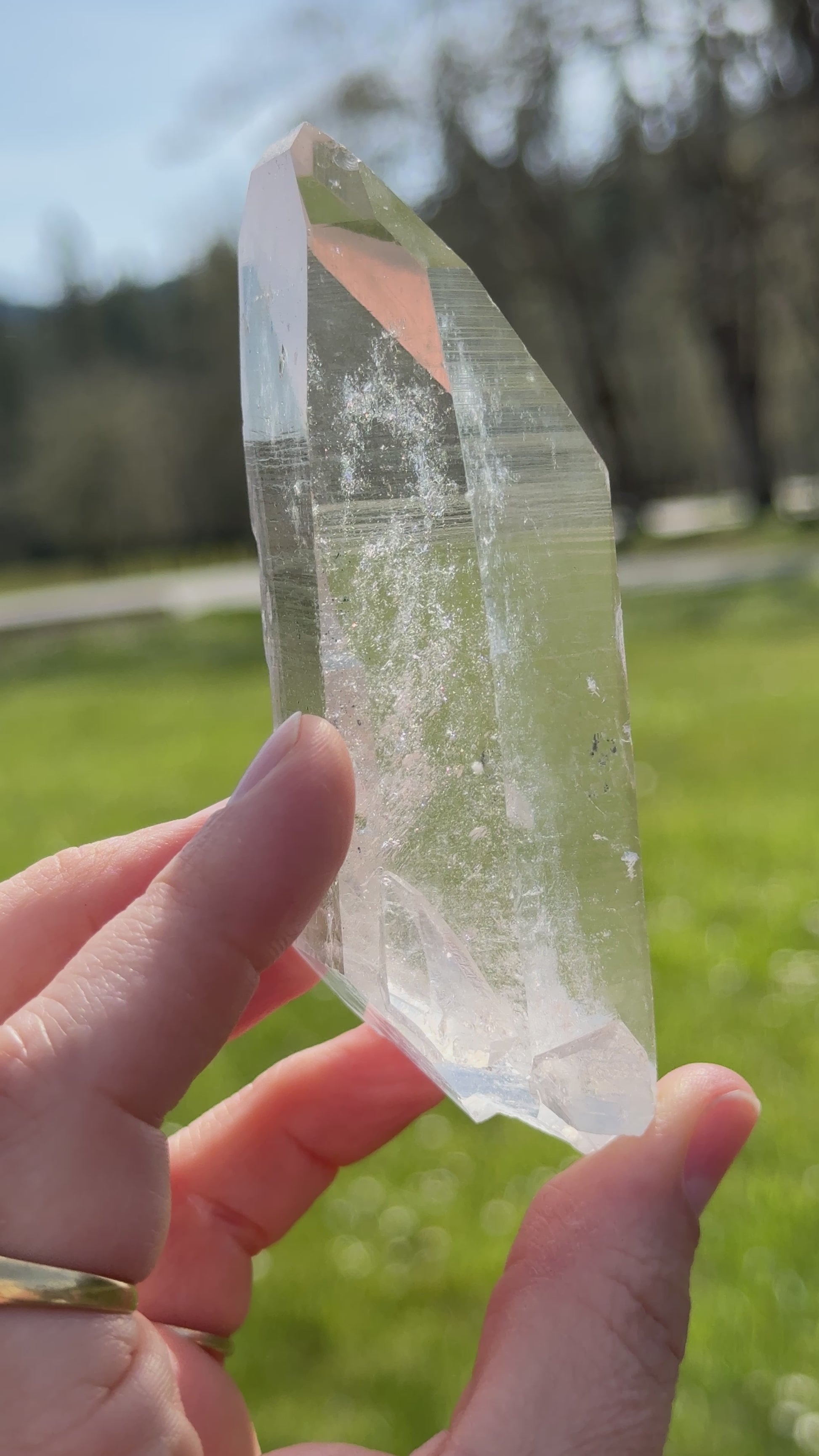 This listing is for the Lemurian quartz shown. Featuring a lustrous quartz crystal with nice striations and great optical clarity this locality is known for. This crystal is double terminated and has unique 8-4 faces, internal fairy frost and a few small penetrator crystals at the base. There are also a few tiny black metallic inclusions inside what is a mostly optical crystal! A magical addition to any collection!