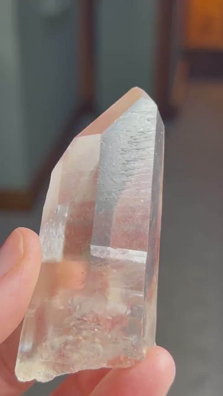 This listing is for the natural unpolished Pink Lemurian Seed Crystal shown. Featuring an unpolished quartz, all natural with really nice lemurian striations and unique surface etchings. Very clear quartz and contact keys around the sides. This crystal has classic Lemurian structure, broader at the base and tapering slightly towards the termination. It has strong and prominent, stepped horizontal Lemurian striations on the front-sides. There is a large future time-link window on the main face. A raw quartz and a beautiful addition to any collection! Self stands vertically on its own base.