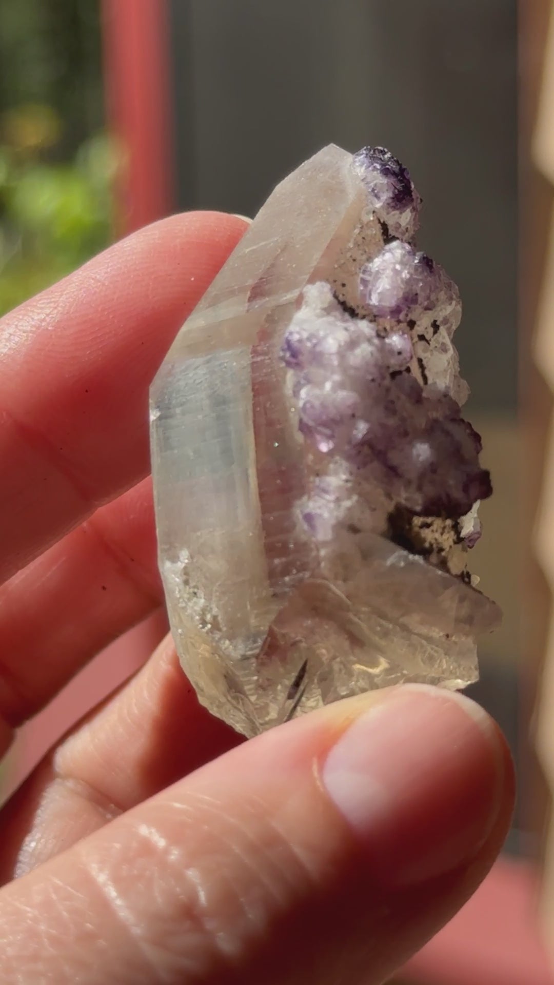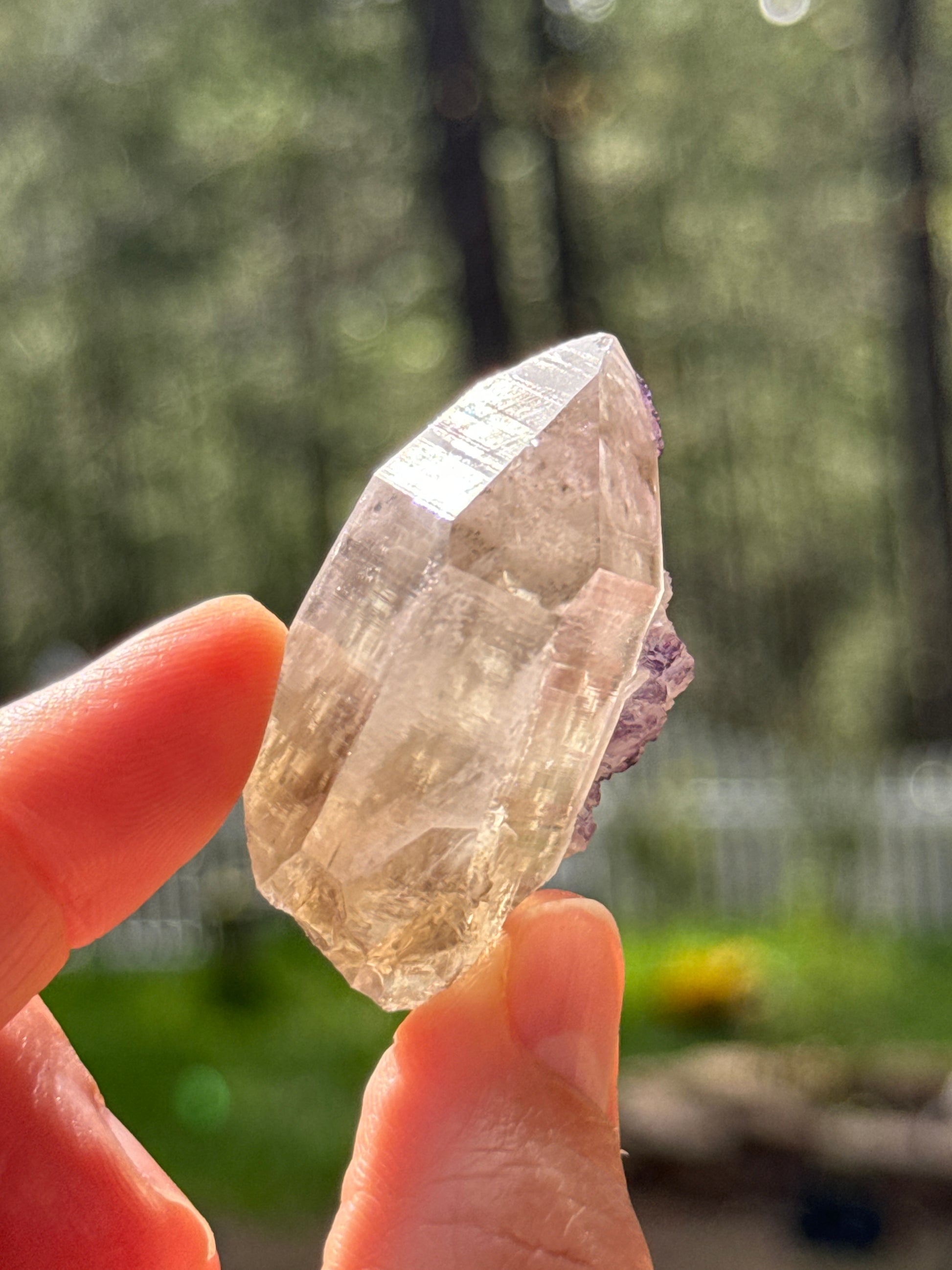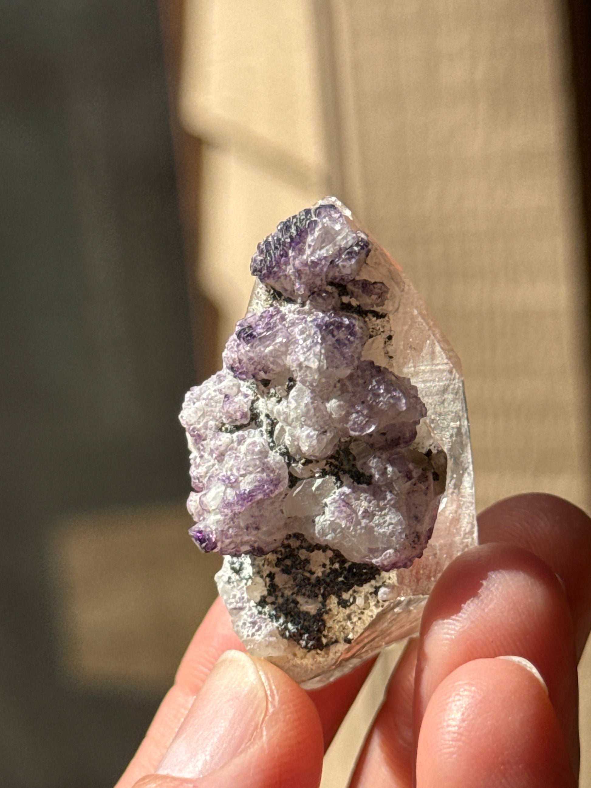 This listing is for the Quartz point shown. Featuring an aesthetic quartz point with purple zoned fluorite scattered on one side. A beautiful quartz crystal from this locality!