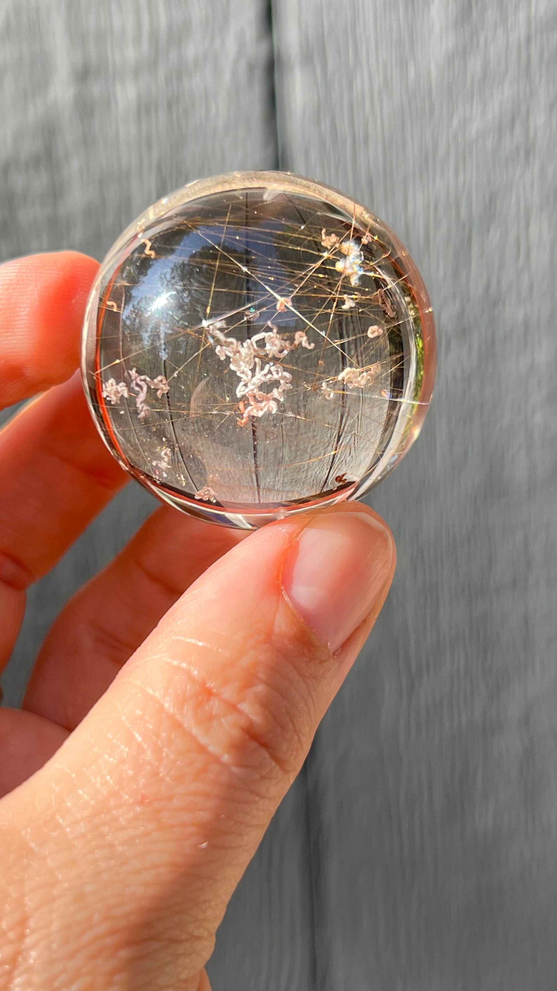 This listing is for the rutilated quartz crystal sphere shown. Featuring a gemmy example of prismatic gold rutile needles in optical quartz. Super unique with rare inclusions of unknown material create a show within this fascinating crystal. This is an insane gem of a piece. A magical addition to any collection!