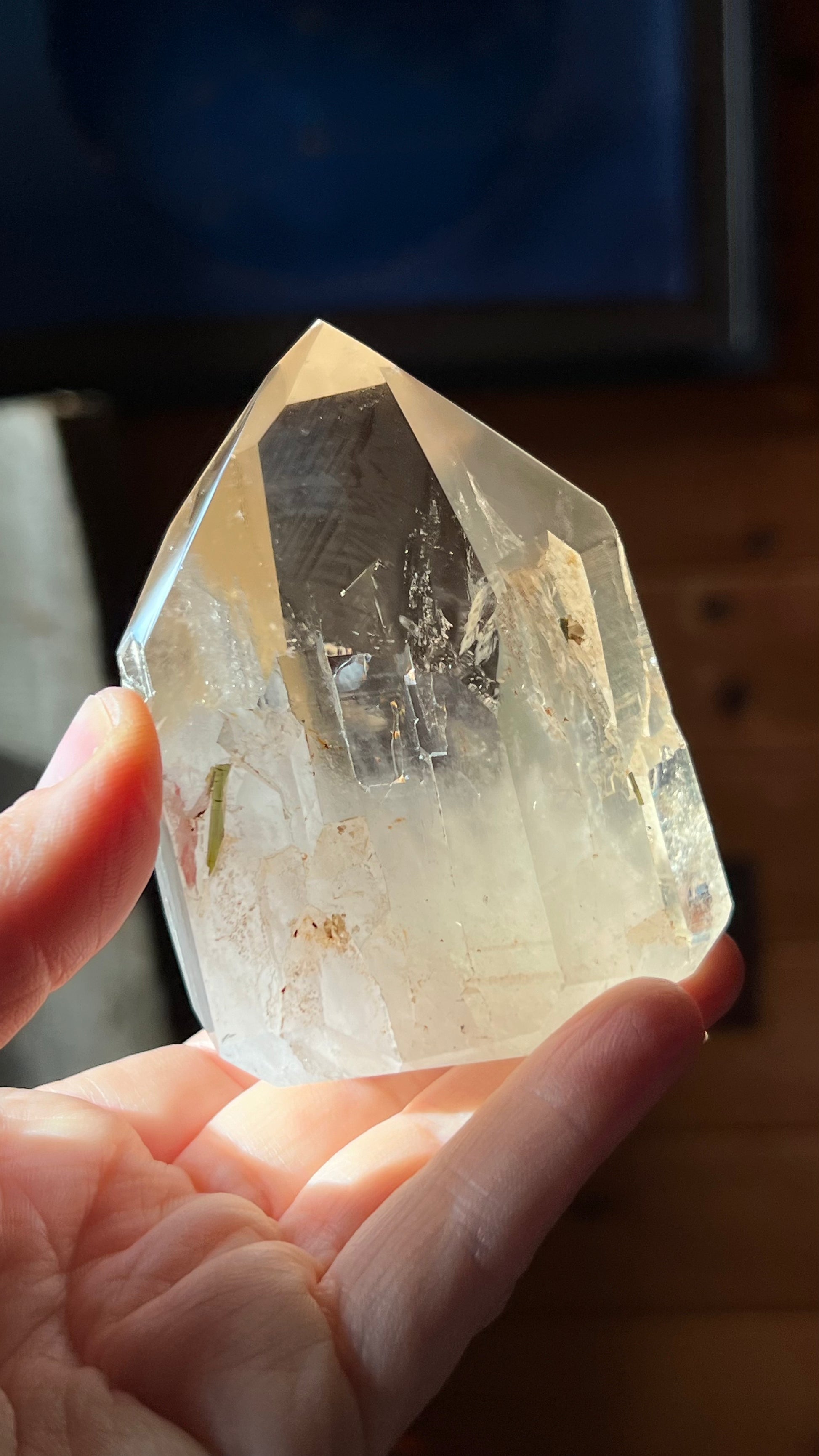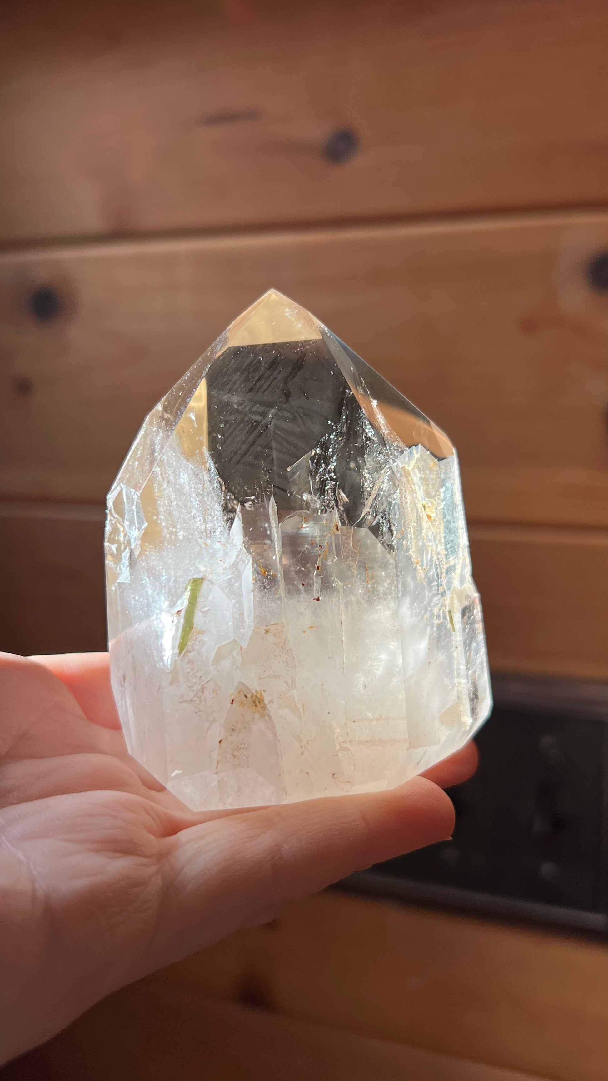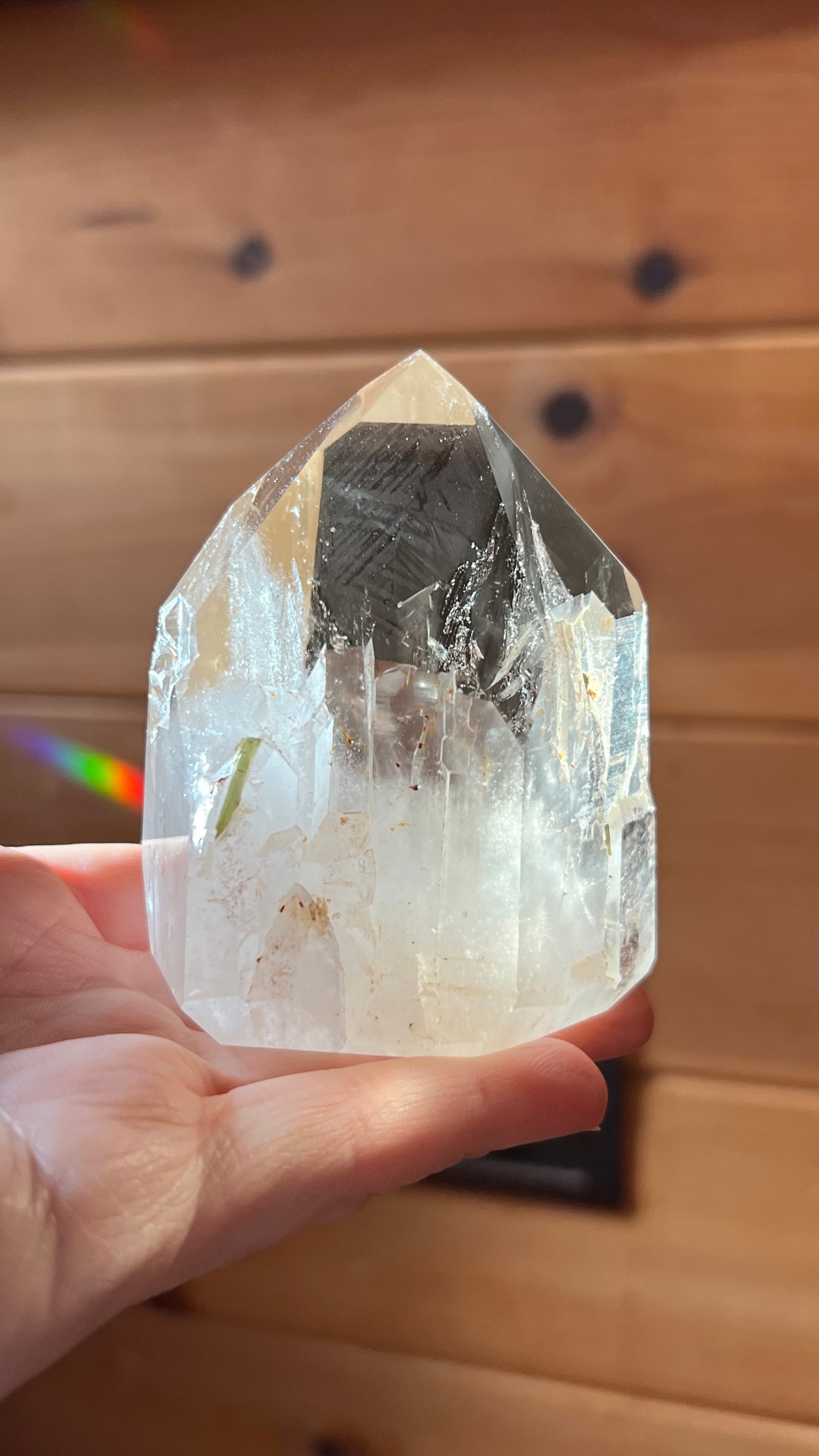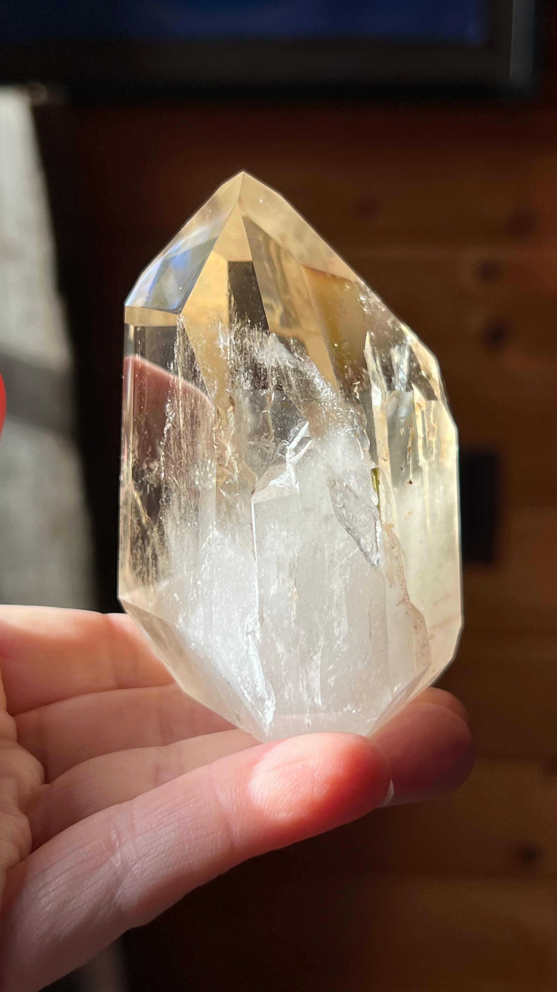 This listing is for the Citrine Generator shown. Featuring a partially polished natural citrine with nice clarity, elestial formation and internal reflective prisms. An inclusion of green tourmaline (elbaite) is partially exposed on the front. A high-quality lustrous citrine with a natural citrine hue. This is natural Citrine (not heated amethyst) and the warmth and overall energy of this tower is inviting. A simply beautiful quartz! The bottom is beveled and polished.