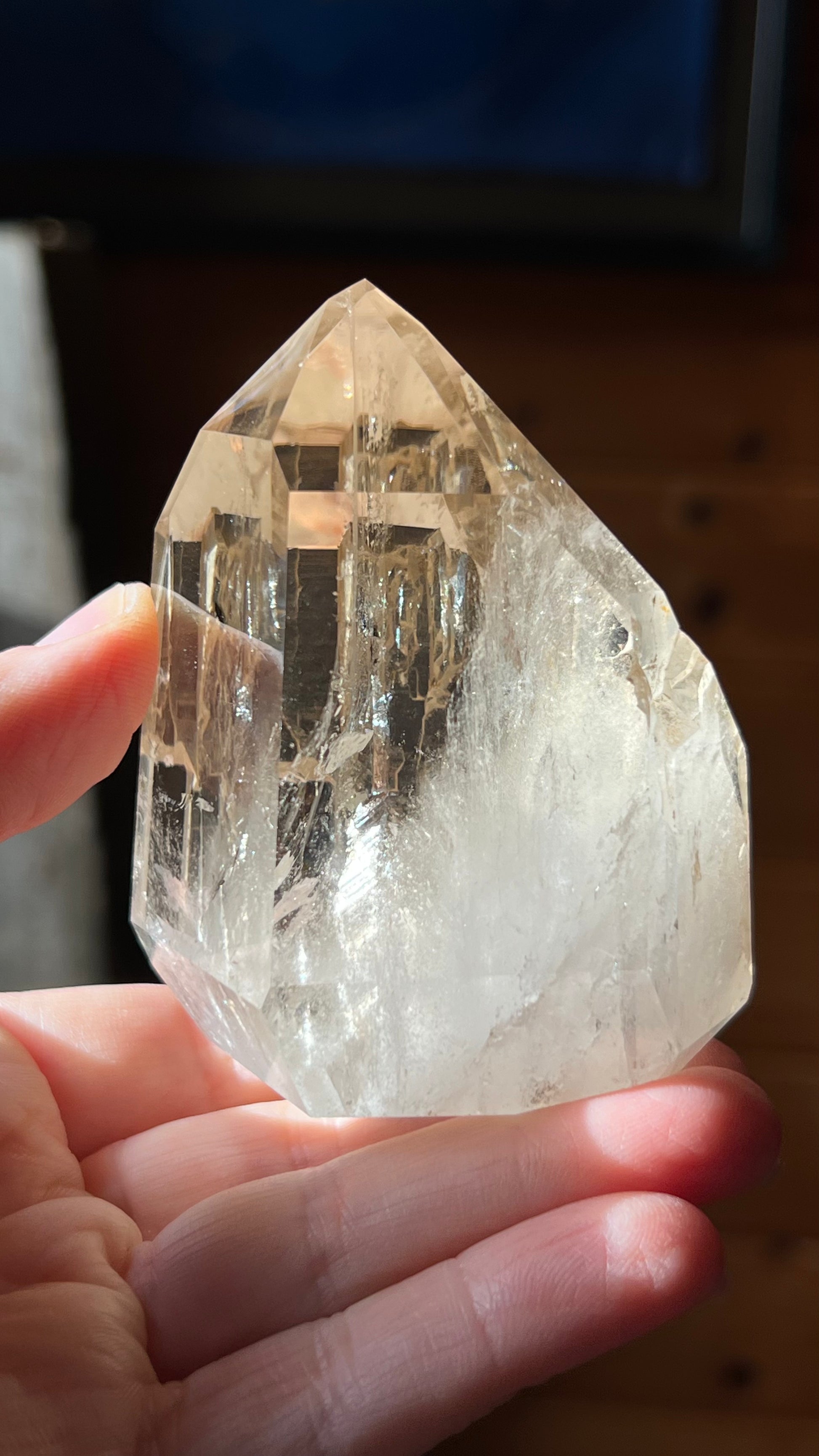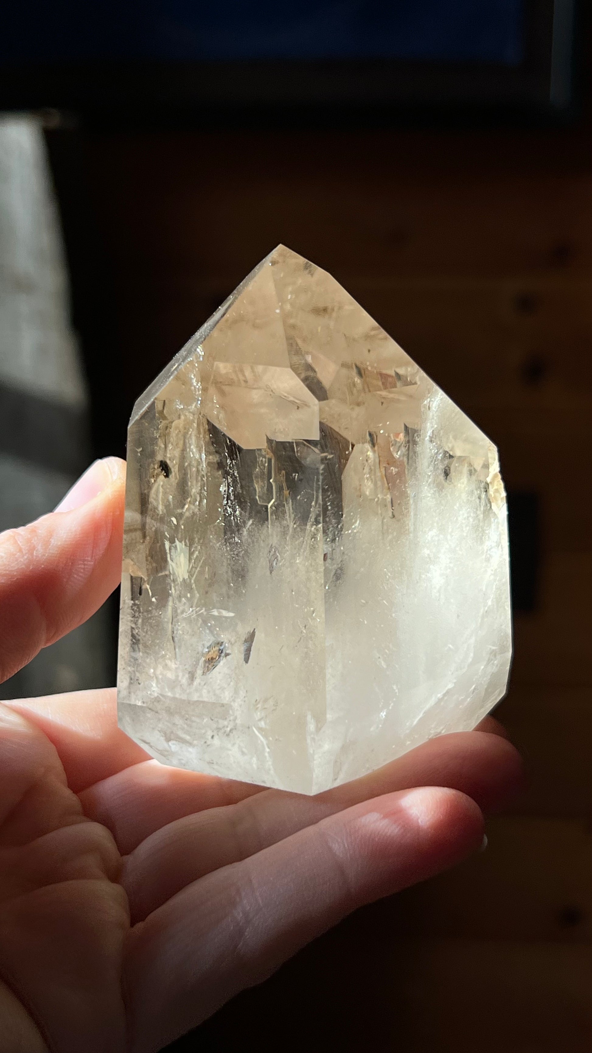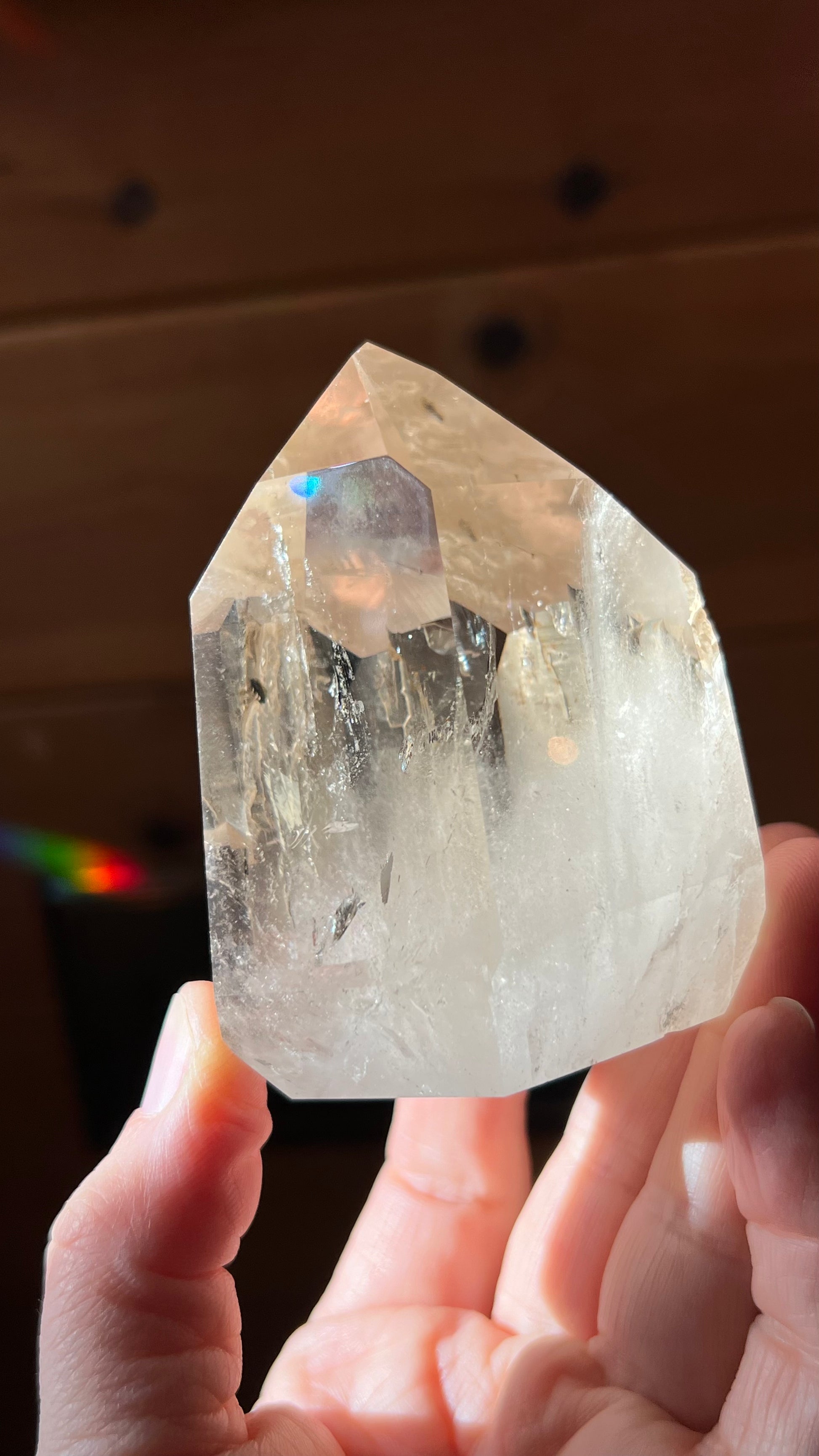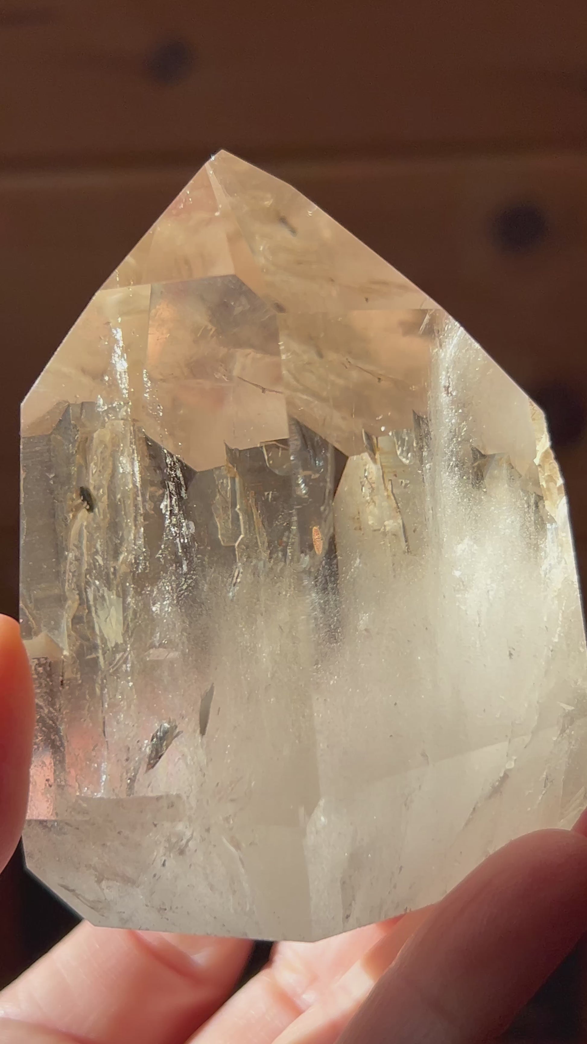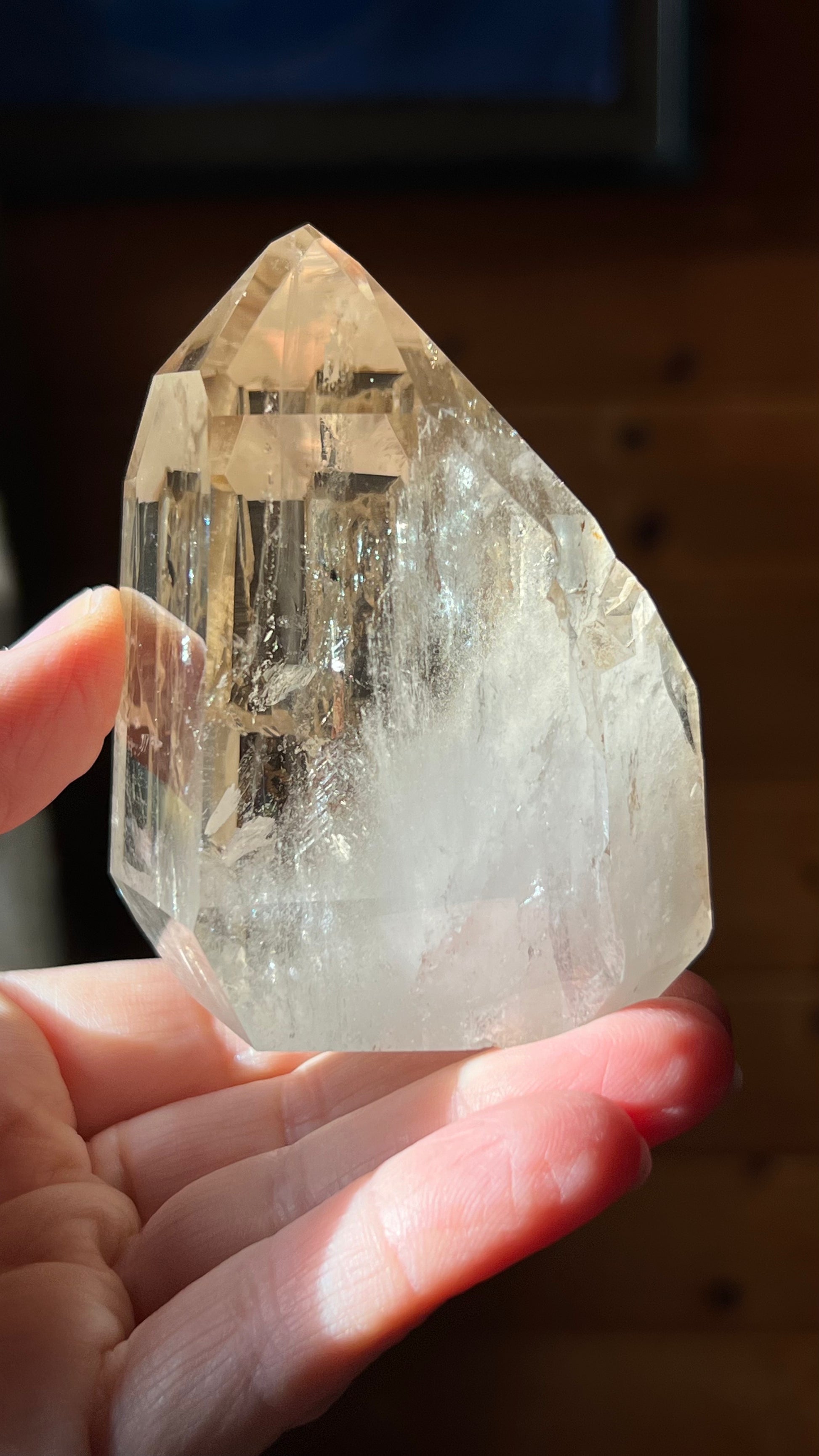 This listing is for the Citrine Generator shown. Featuring a partially polished natural citrine with nice clarity, elestial formation and internal reflective prisms. An inclusion of green tourmaline (elbaite) is partially exposed on the front. A high-quality lustrous citrine with a natural citrine hue. This is natural Citrine (not heated amethyst) and the warmth and overall energy of this tower is inviting. A simply beautiful quartz! The bottom is beveled and polished.