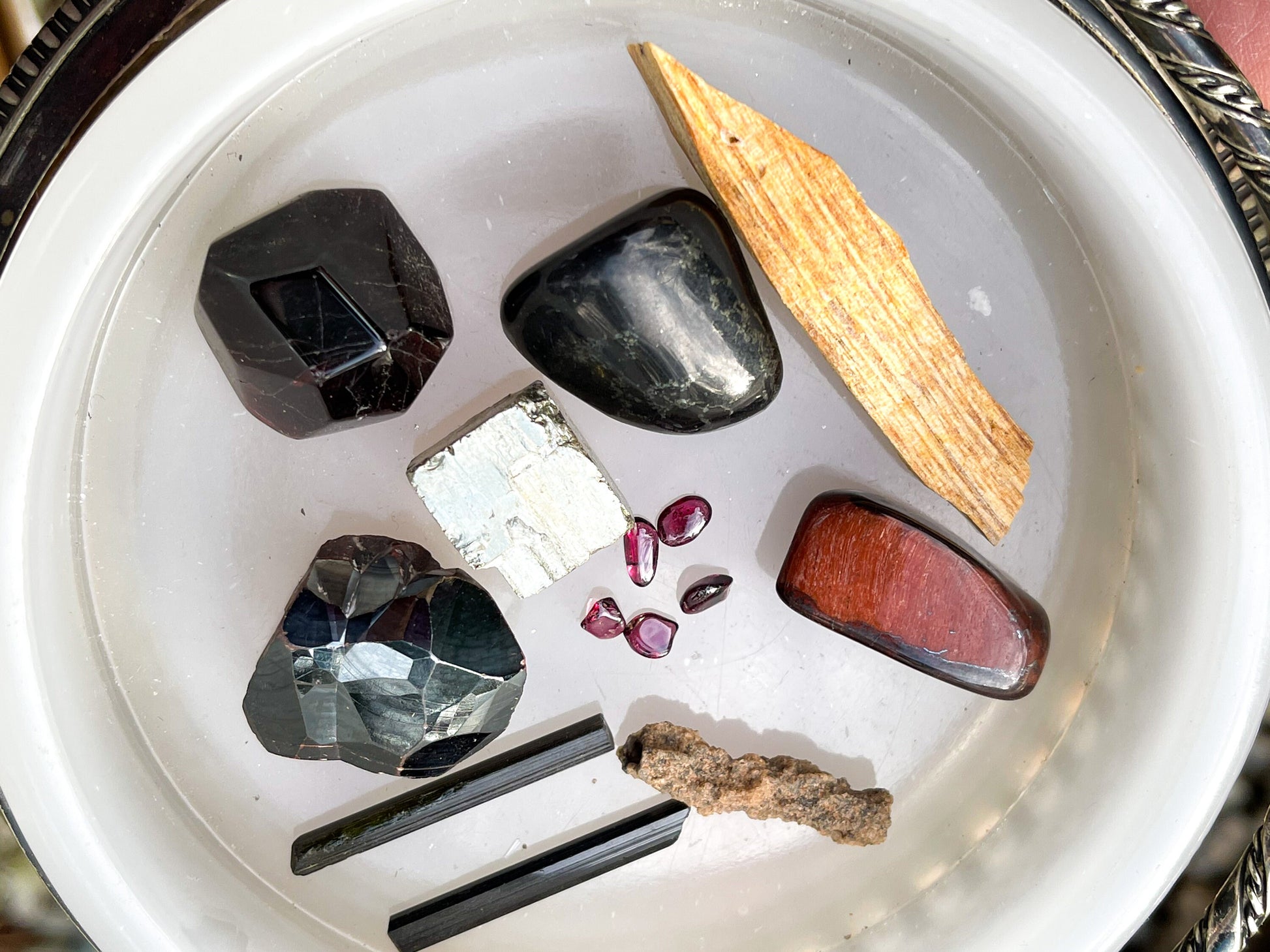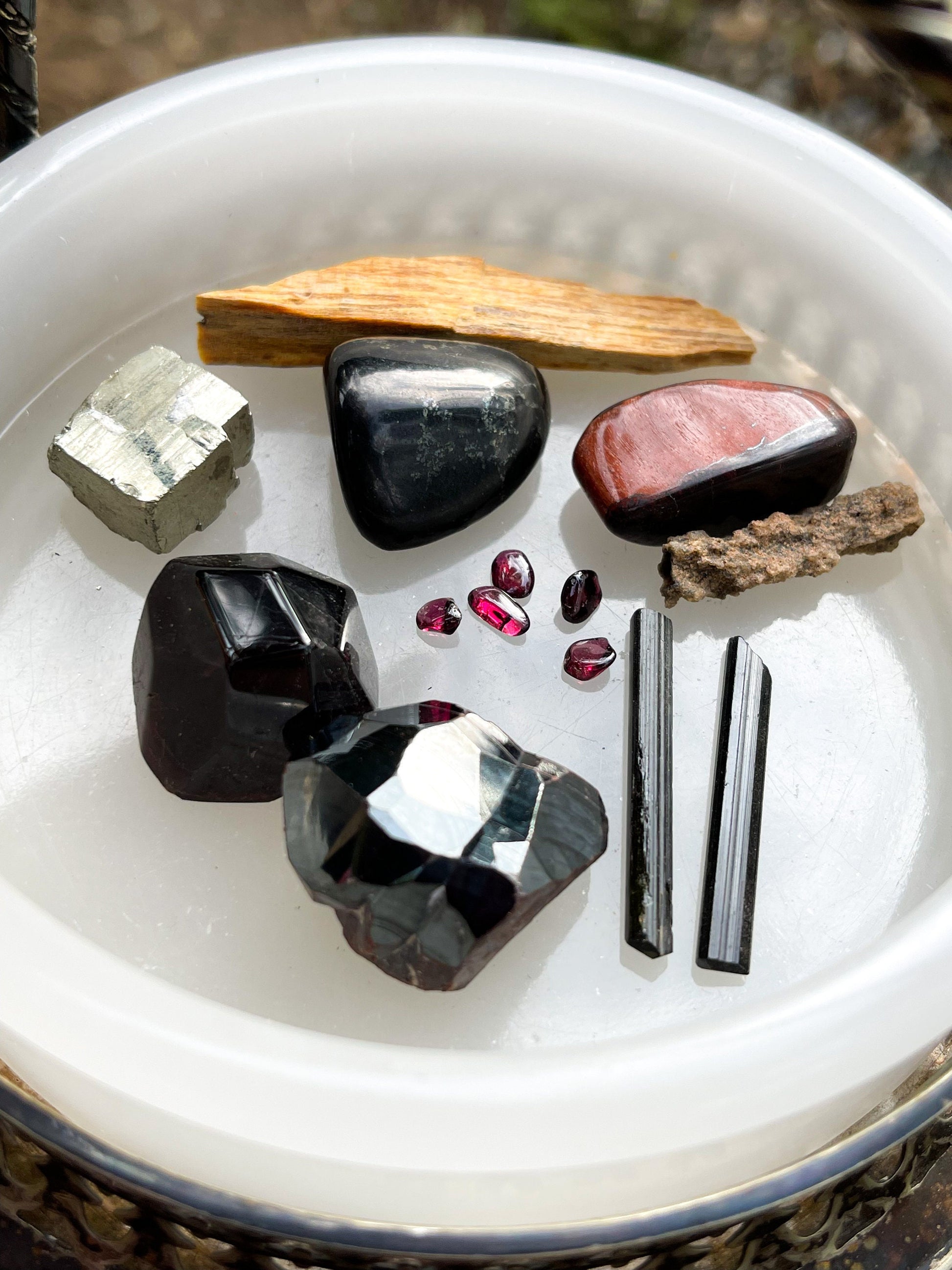 This listing is for one (1) Intention Kit: Protection Crystal Set, ROOT Chakra created by Lylith Aradia Moon at Far Arden Essentials. Featuring a quality collection of crystals and minerals specifically chosen for your root chakra energy work. Your root energy sphere is related to protection, stability, safety, passion, manifestation and contentment. When your root chakra is in balance you feel grounded, content, focused and secure. You are able to complete daily tasks with ease, in a tranquil flow state. You are wise, yet humble and have an inquisitive sense of being. You are protected and feel safe and secure in your daily life. When your root chakra is out of balance you may feel unstable, insecure, vulnerable and suspicious. You have a pessimistic perspective and may have a hard time trusting your own intuition. This set contains the following: Schorl Black Tourmaline Garnet Pyrite Hematite Red tigers eye Obsidian Fulgurite Palo Santo These sets are limited edition and intuitively created with the utmost care and white light energy to assist you in your work. Each set is pure, using only quality material from our extensive inventory at Far Arden. Only a handful of these sets are available at any given time. Thank you for allowing us to provide the tools so very necessary in this life we are experiencing. ~To a constant state of evolution, divinely guided~ ☽❣☾ These mixed lots are perfect for your altars, crystal grids, jewelry making and giving! We provide only the highest quality gemstones, please shop with confidence.