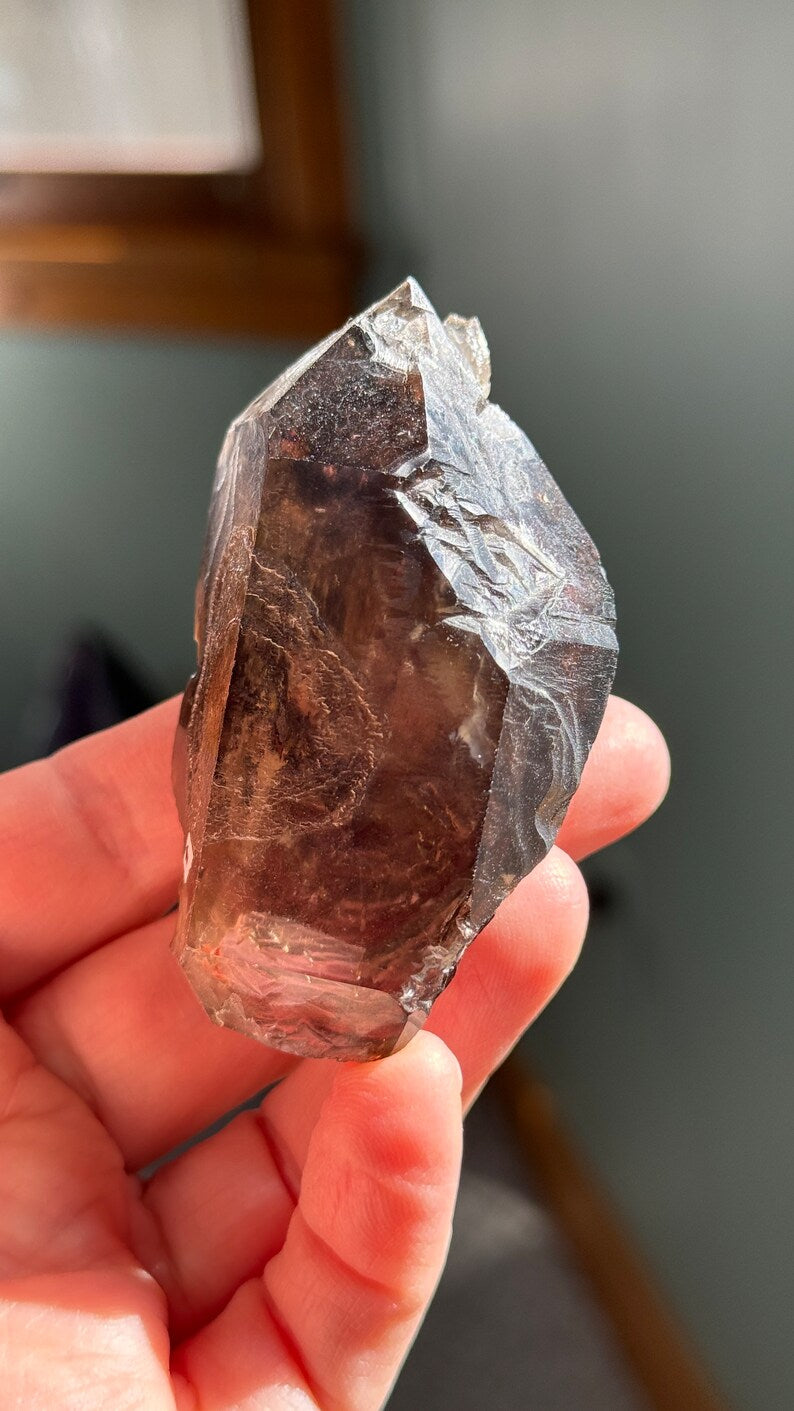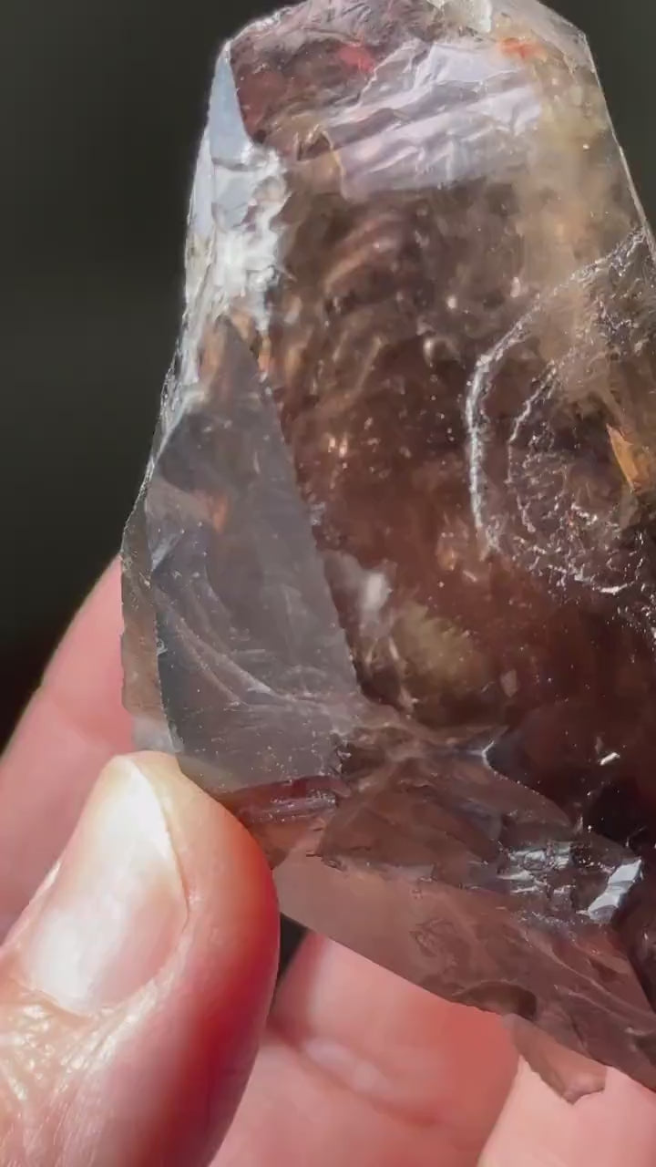 This listing is for the smoky elestial quartz crystal shown. Featuring a quartz scepter dt (double terminated) with really nice luster, elestial formations and at least one moving enhydro inside. There are multiple suspended bubbles as well as an area of pinkish amethyst within the crystal. Multiple reflective prismatic rainbows that catch your eye! It's a spectacular piece of material. Very high quality, magical to the touch!