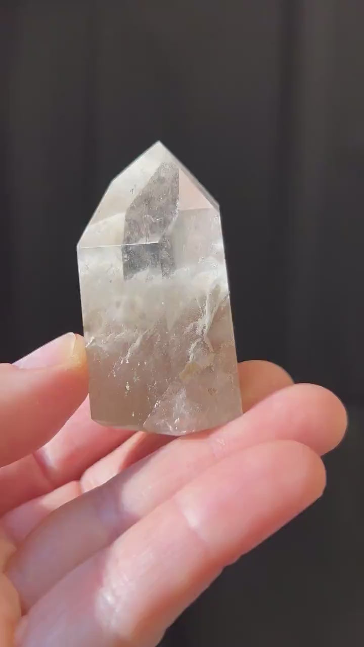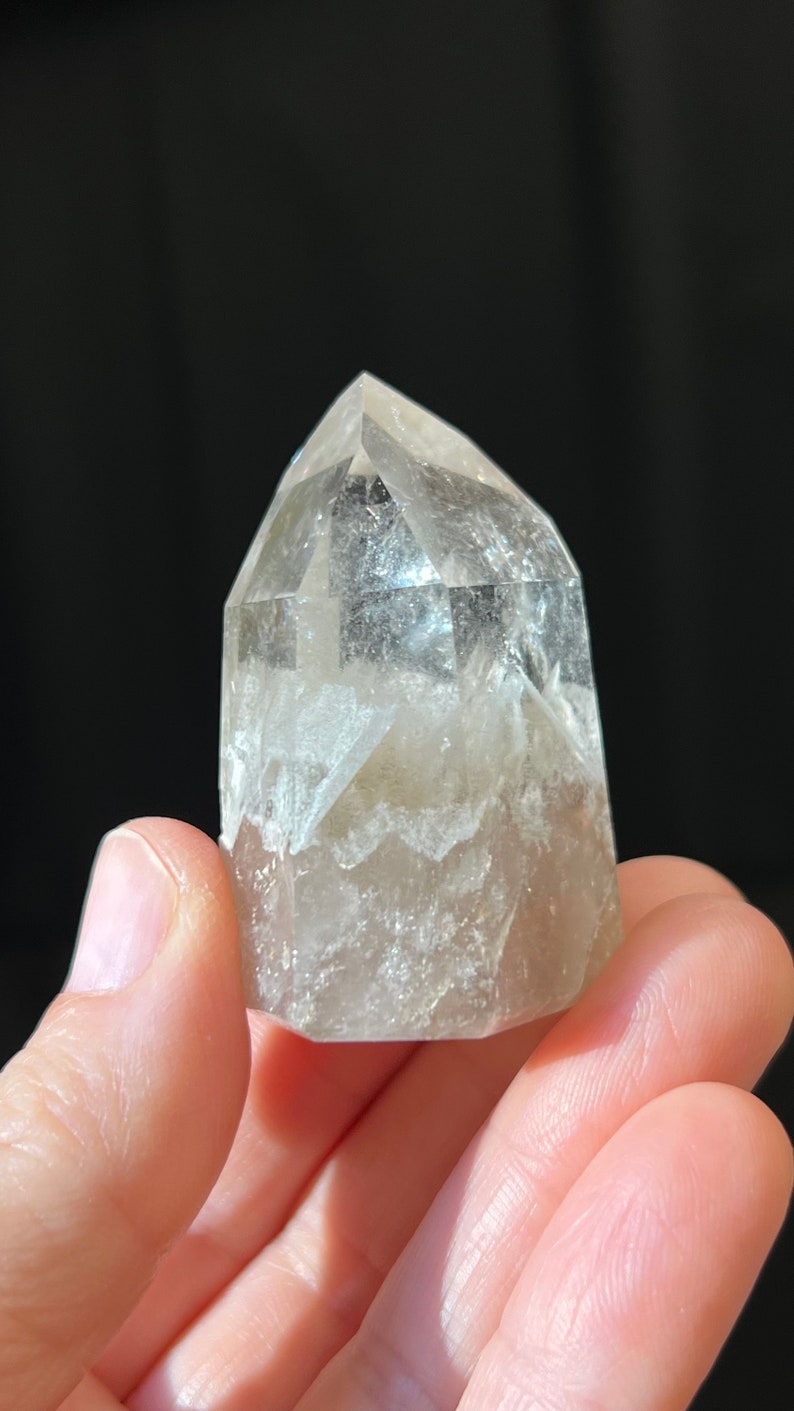 This Quartz features a "phantom" a deposit of minerals or crystals that are created during the formation of the quartz. Clearly visible through the crystal, in the same formation of the quartz.