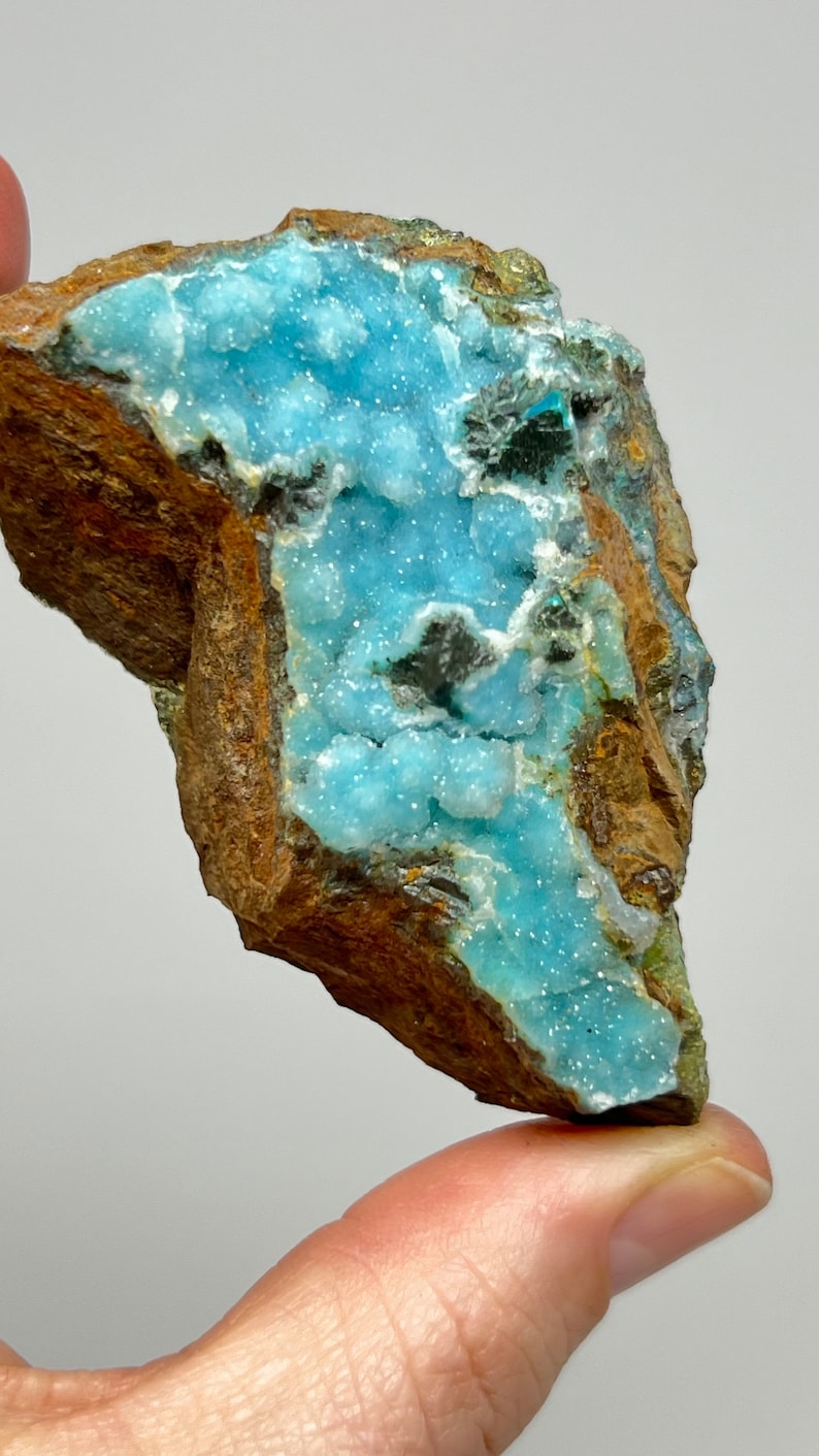 This listing is for the Chrysocolla shown. This is a beautiful mineral of vibrant blue Chrysocolla in beautiful stalactite and botryoidal sparkling druse formation. Natural and raw with vibrant color. This is an older specimen from the famous Ray Mine of gorgeous sky-blue, chrysocolla-tinted, drusy blue quartz growing on chrysocolla stalactites. Displays beautifully on its own natural side.