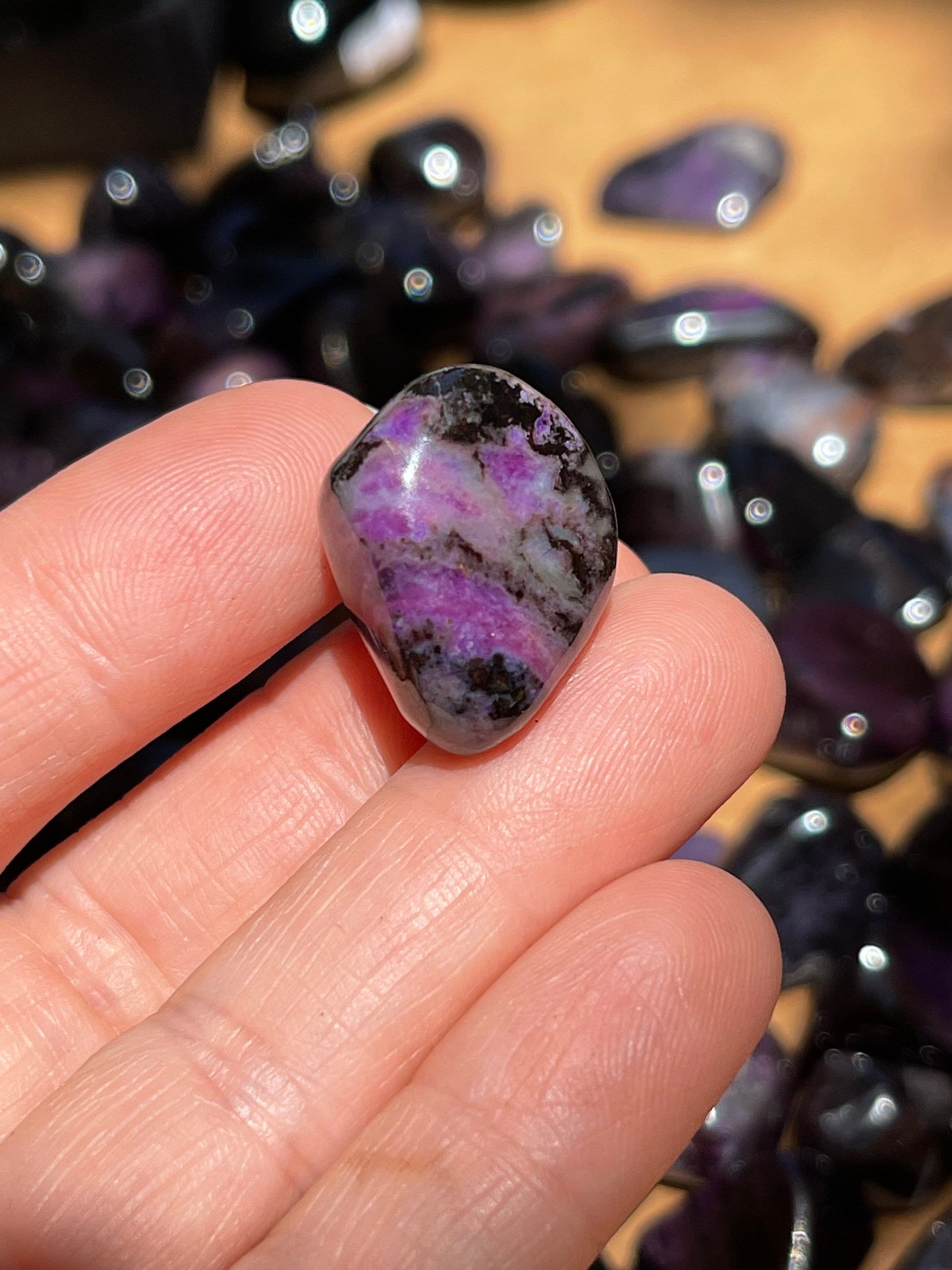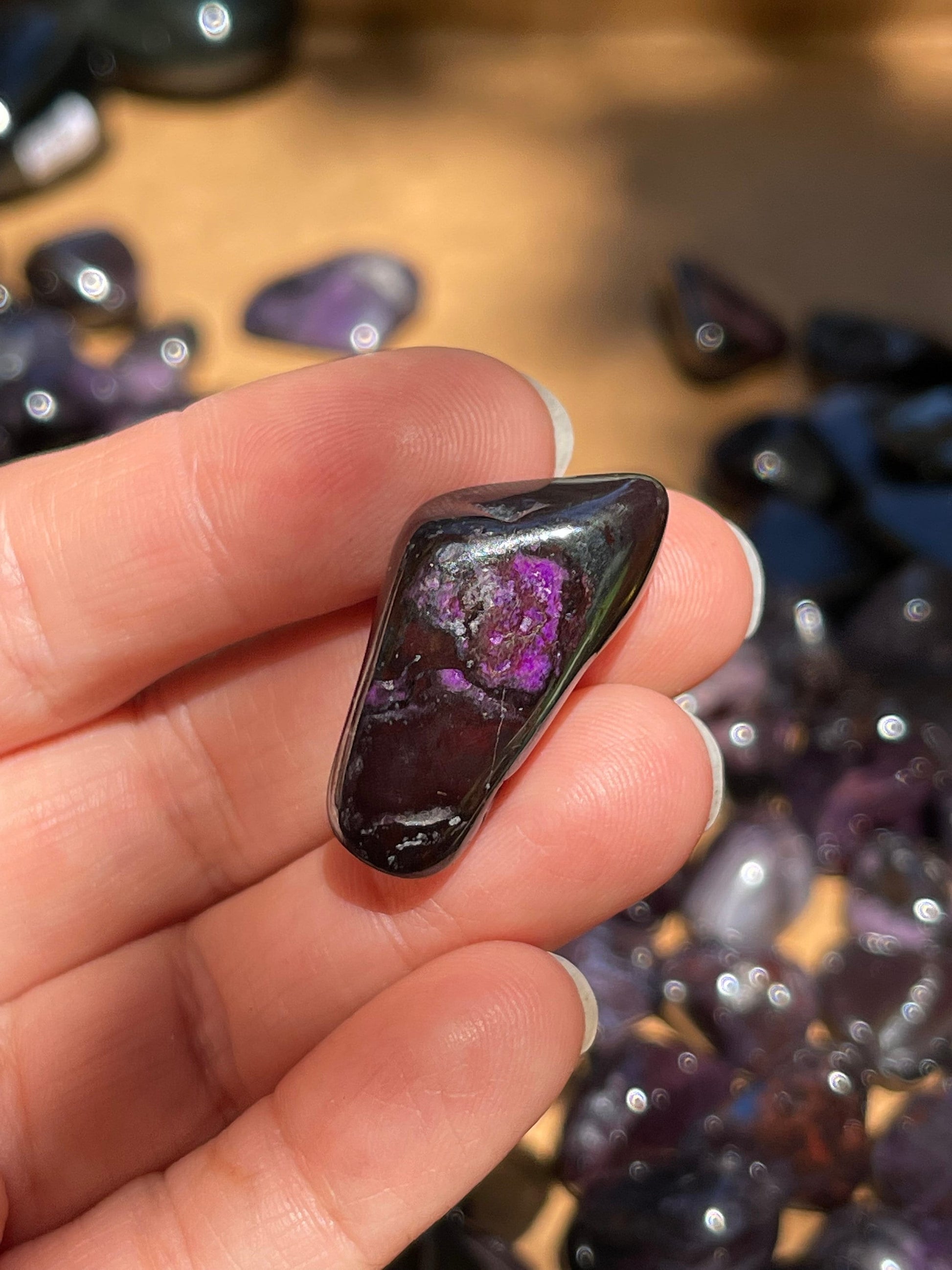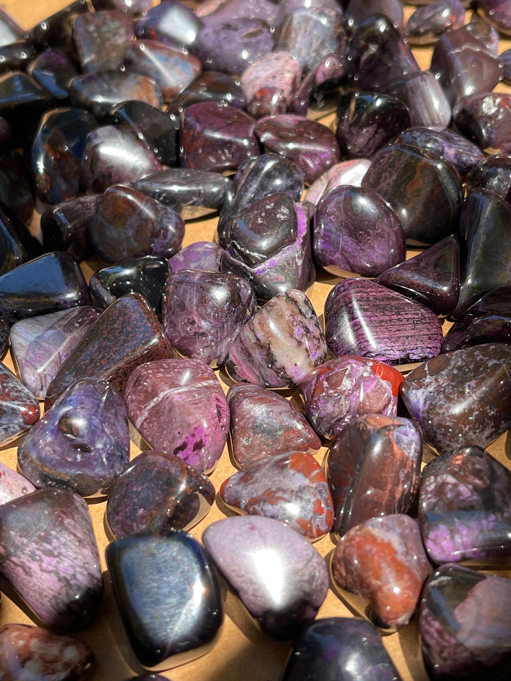 This listing is for top quality Sugilite, also known as Luvulite. The energy and color of these pieces are beautiful - shades ranging from pink to dark purple sugilite. Some have pink bustamite and vibrant blue richterite. A magical addition to any collection! You will receive your selection from the lot shown above. Price is for (1) A grade Sugilite.