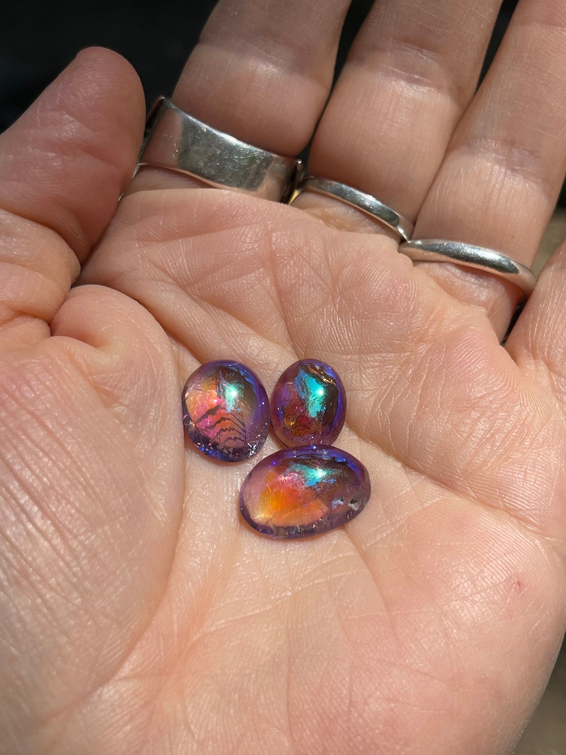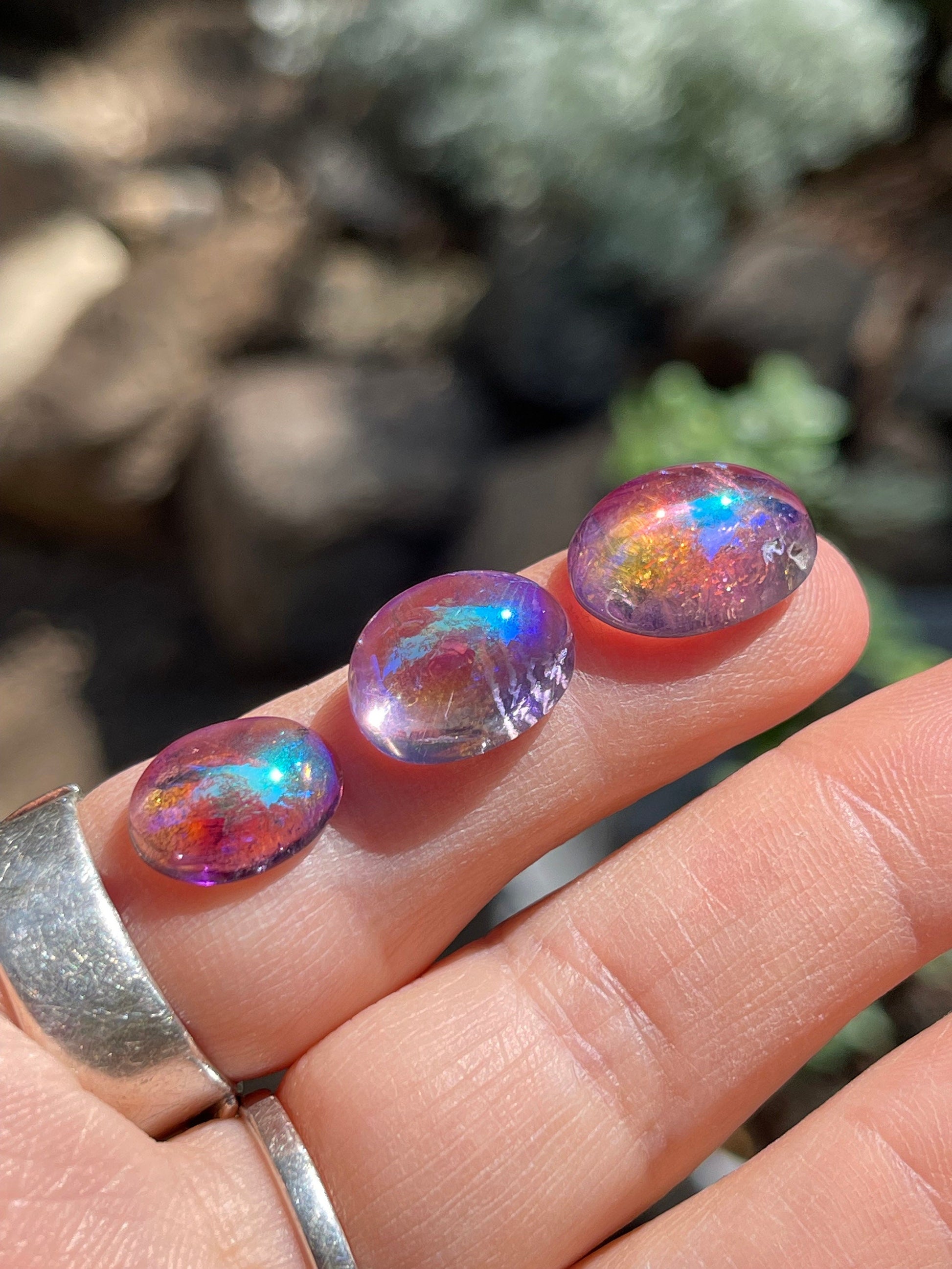 This listing is for top quality Angel Aura Amethyst Gemstones dome cabochons shown. Dome top, flat bottoms. These gorgeous Amethyst are just beautiful..very gemmy, with amazing clarity..color ranges from nice rich lavender to purple to pink amethyst, also known as Rose de France. Price is for 3 pieces! These are super hard to find. They have a very crystal ball-like appearance, mystical! This lot is from an old collection that we kept in our private collection and aura enhanced a small batch. Enjoy!