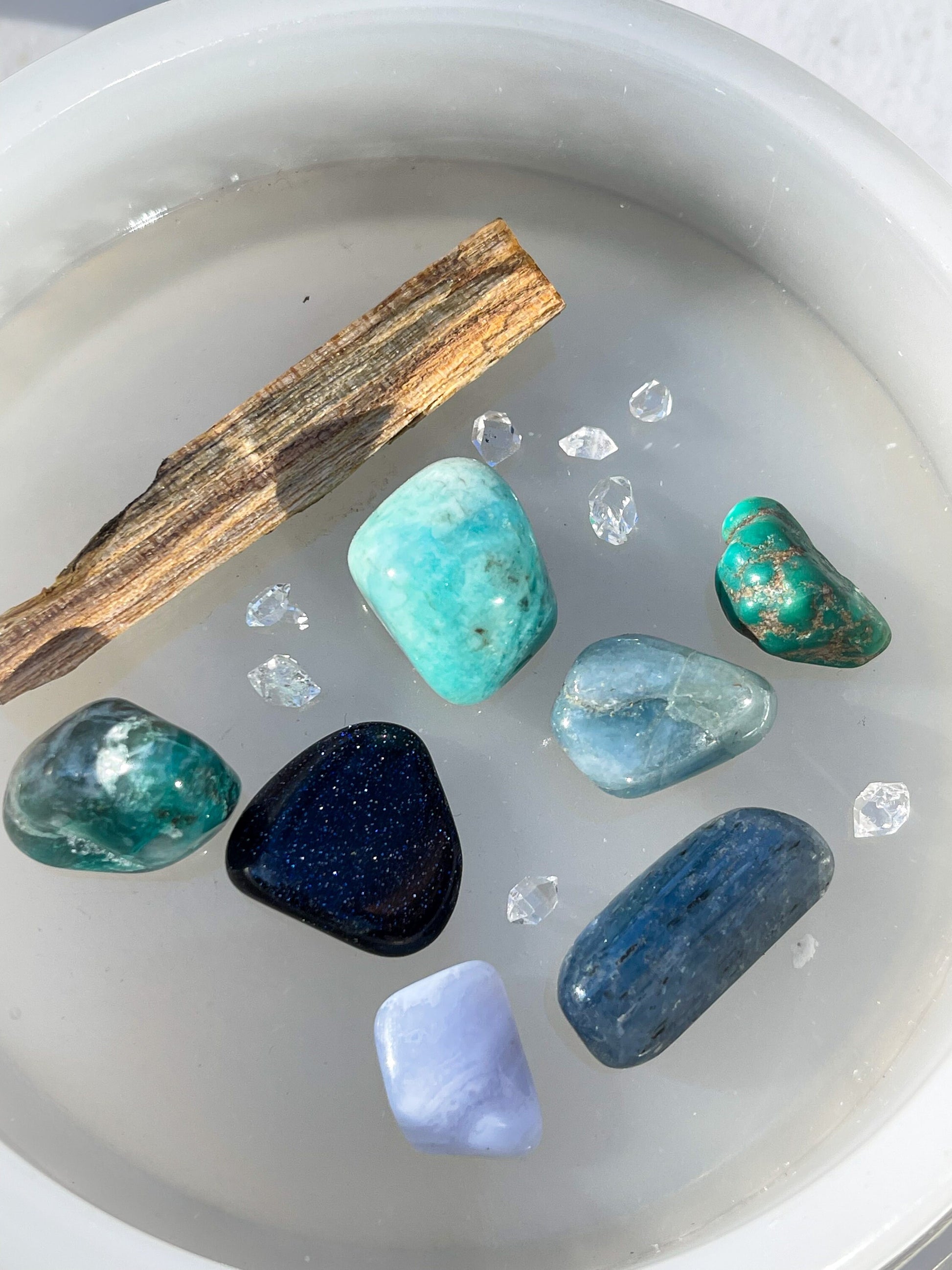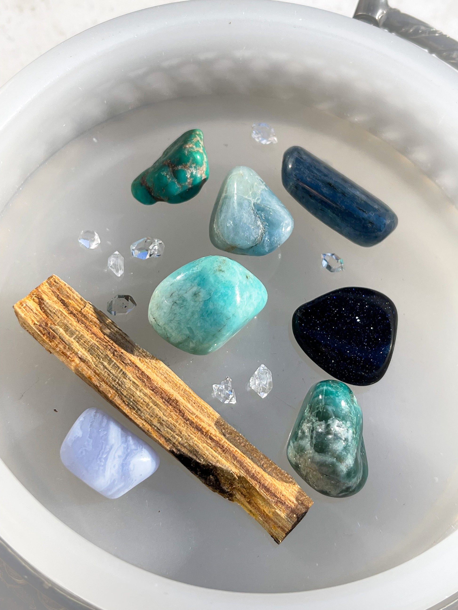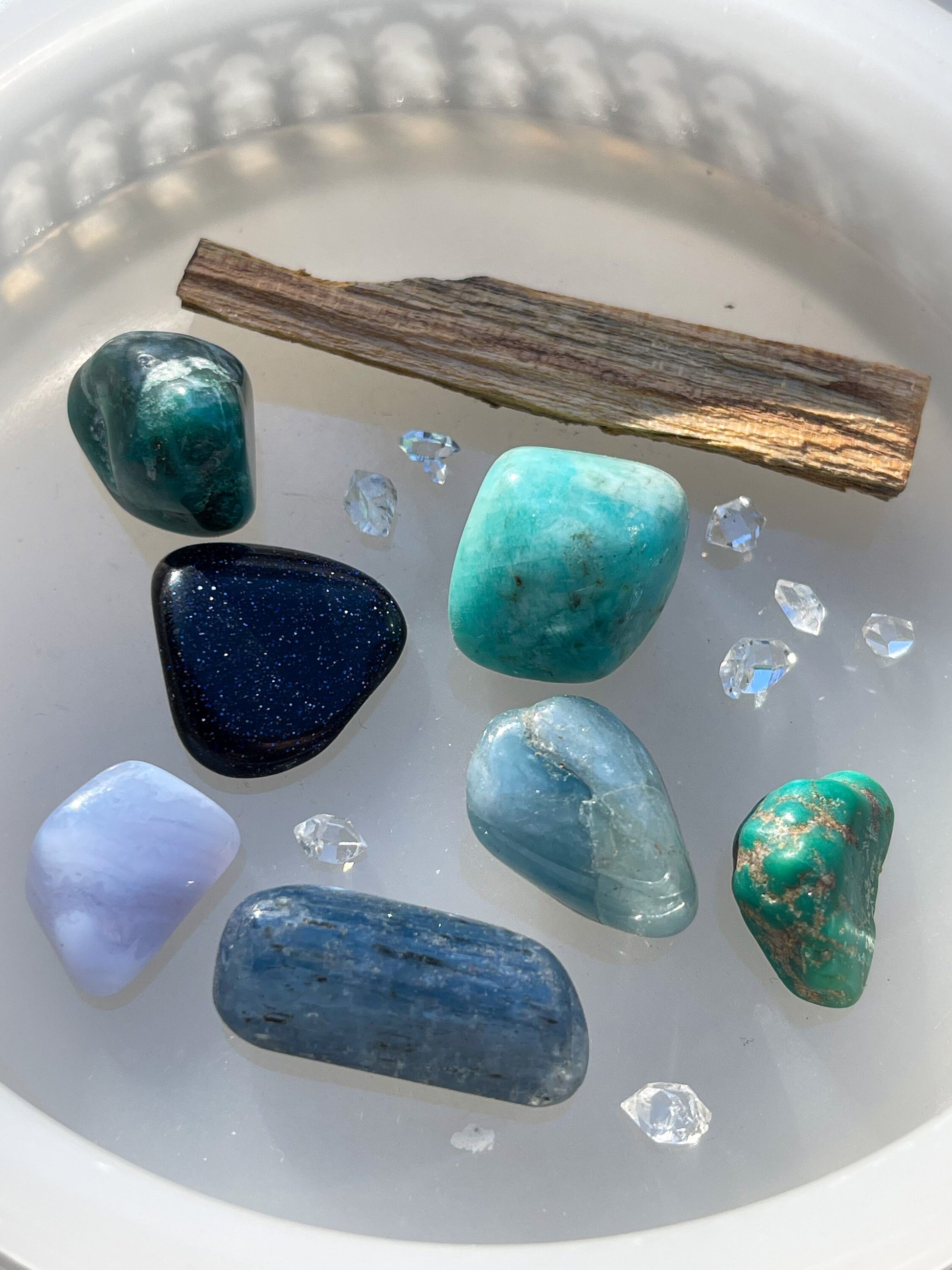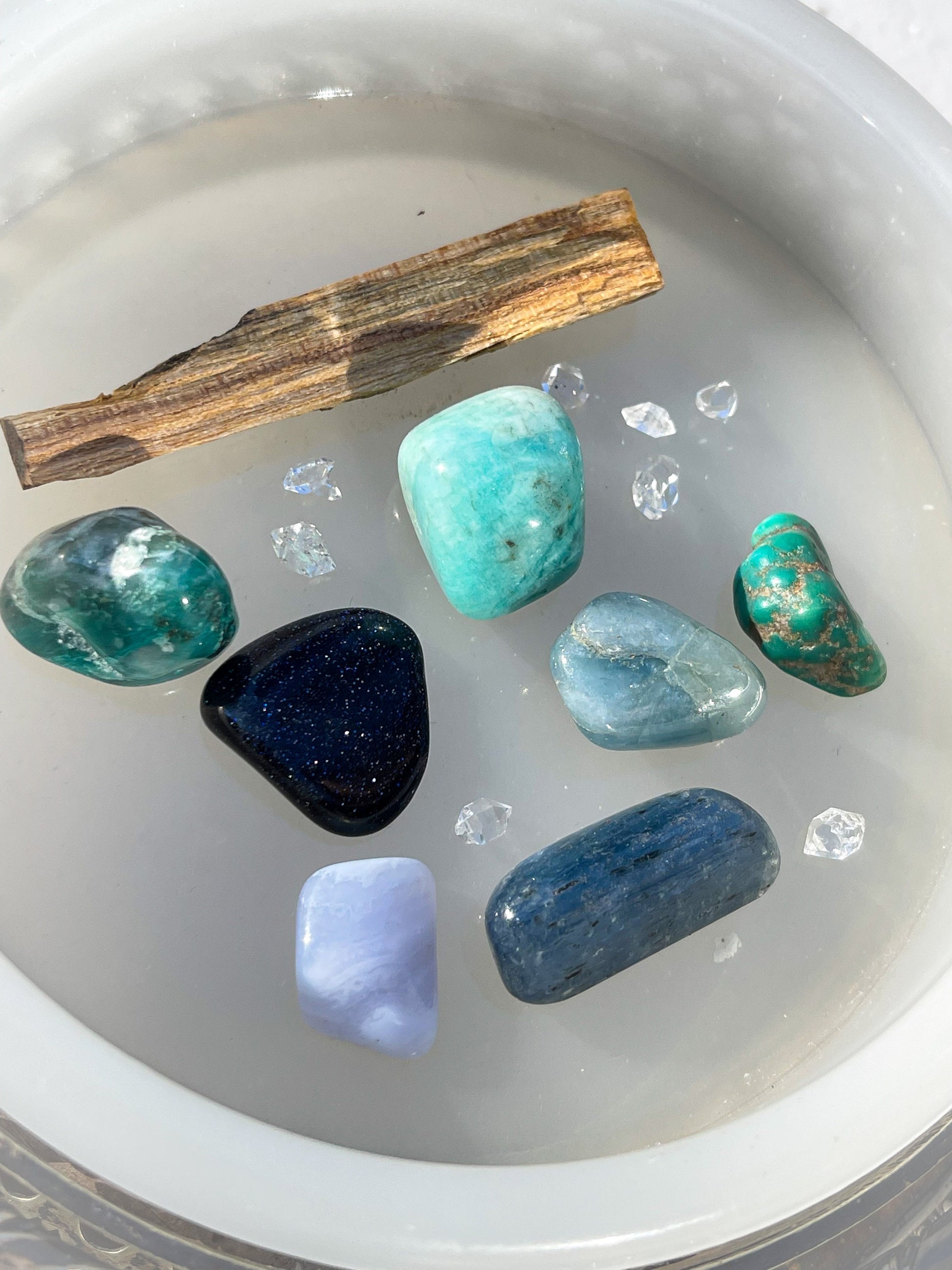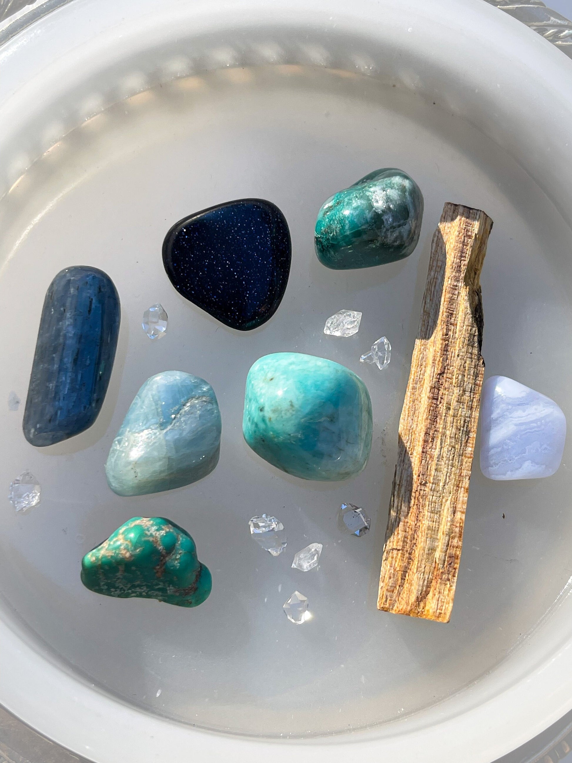 This listing is for one (1) Intention Kit: Communication Crystal Set, THROAT Chakra created by Lylith Aradia Moon at Far Arden Essentials. Featuring a quality collection of crystals and minerals specifically chosen for your throat chakra energy work. Your throat energy sphere is related to speaking your truth, clear communication and visions, loyalty to your self and others. When your throat chakra is in balance you feel connected, open and honest. You are loyal, confident and feel as if you are easily able to make yourself seen and heard. When your throat chakra is out of balance you may feel quiet and suppressed, opposed and persecuted. You lack the confidence to be yourself and have social fear and have a need to over please people around you. This set contains the following: Kyanite Blue Lace Agate Amazonite Dumorterire Blue Goldstone Apatite Herkimer Diamonds Palo Santo These sets are limited edition and intuitively created with the utmost care and white light energy to assist you in your work. Each set is pure, using only quality material from our extensive inventory at Far Arden. Only a handful of these sets are available at any given time. Thank you for allowing us to provide the tools so very necessary in this life we are experiencing. ~To a constant state of evolution, divinely guided~ ☽❣☾ These mixed lots are perfect for your altars, crystal grids, jewelry making and giving! We provide only the highest quality gemstones, please shop with confidence.